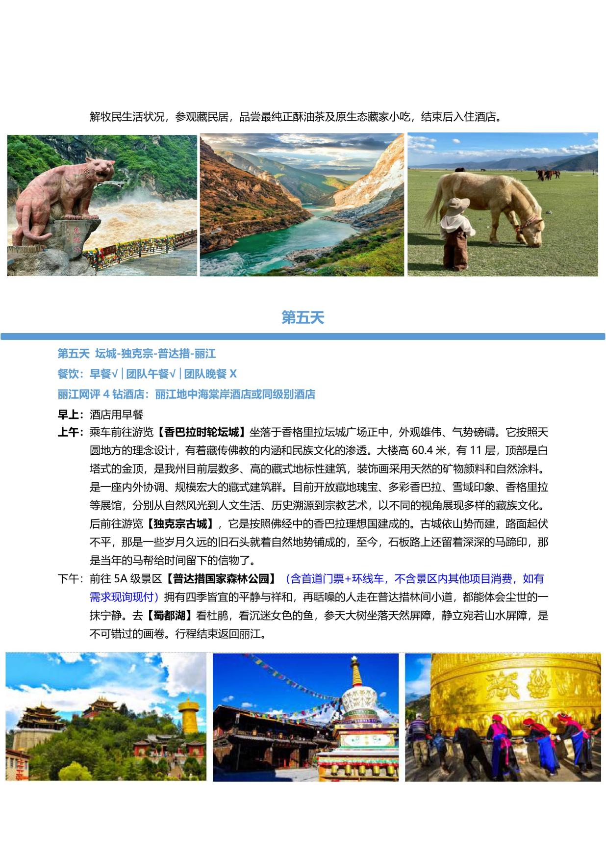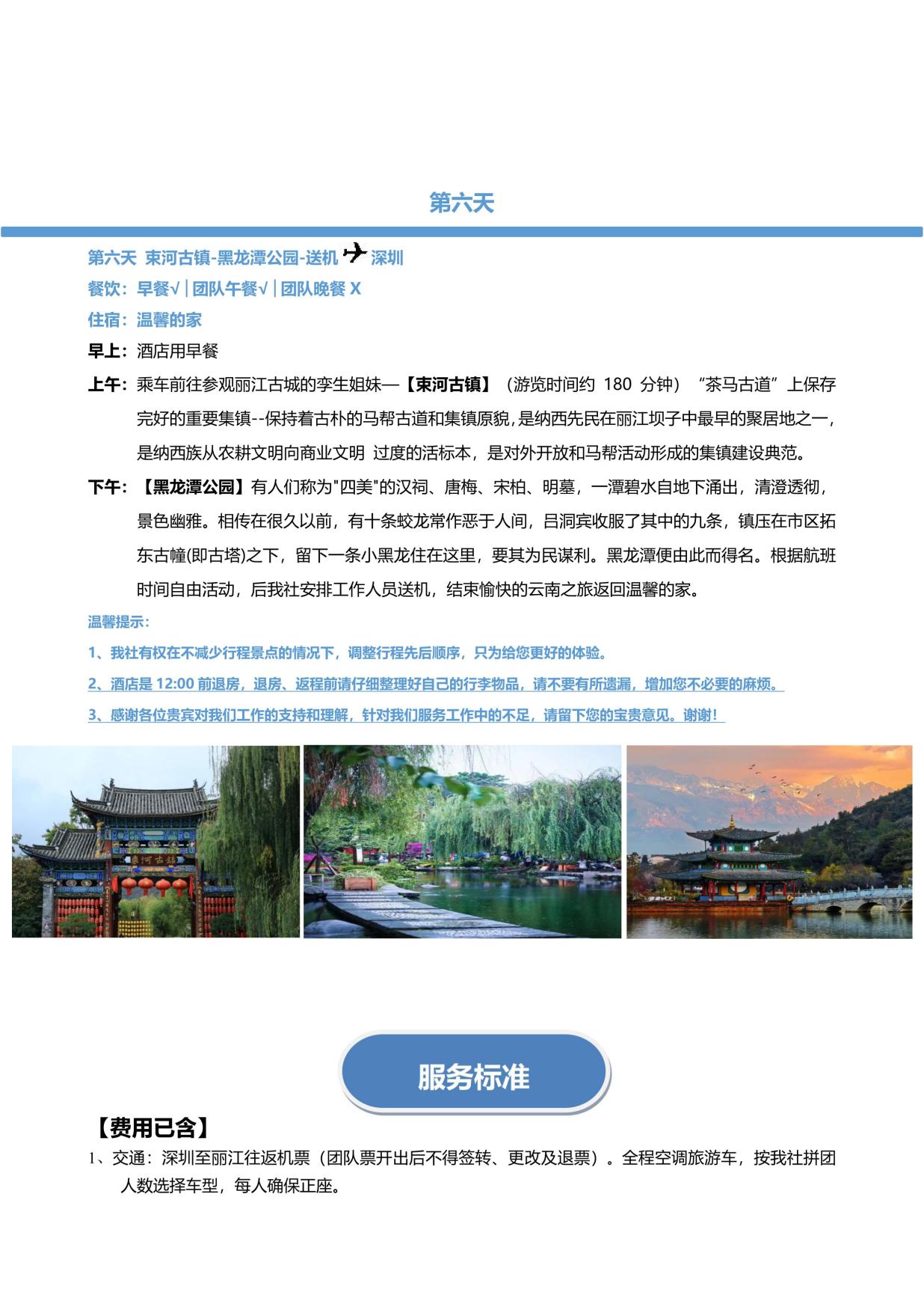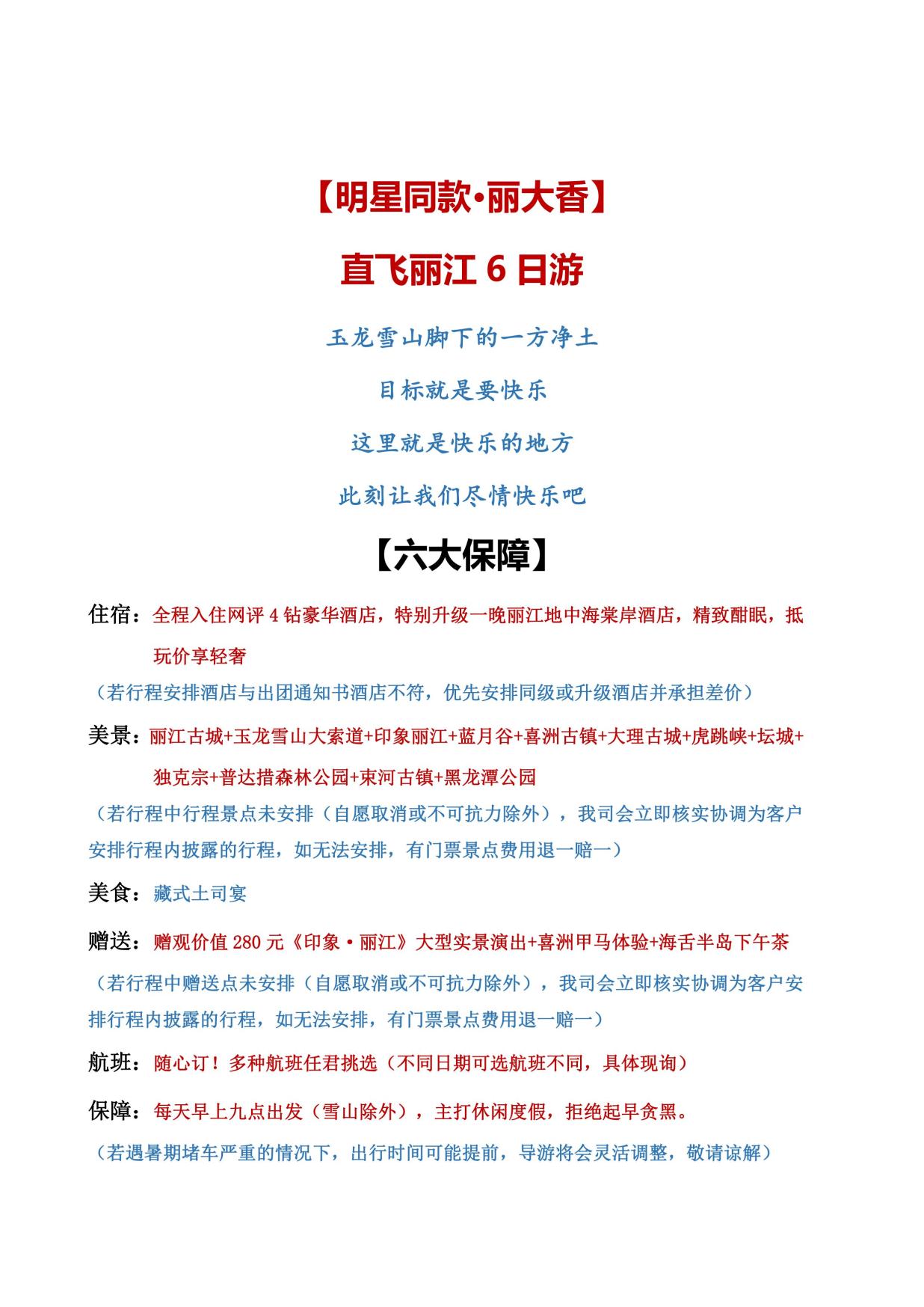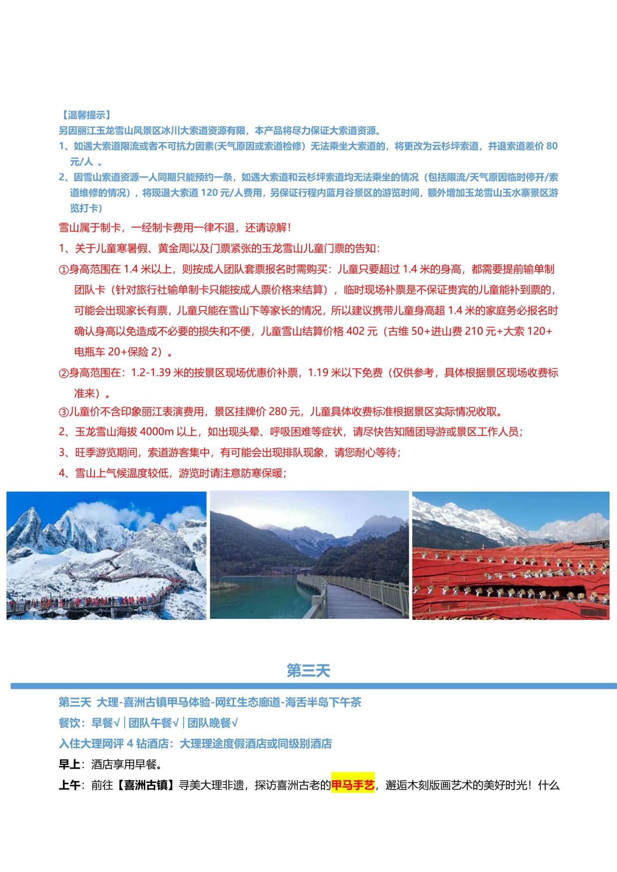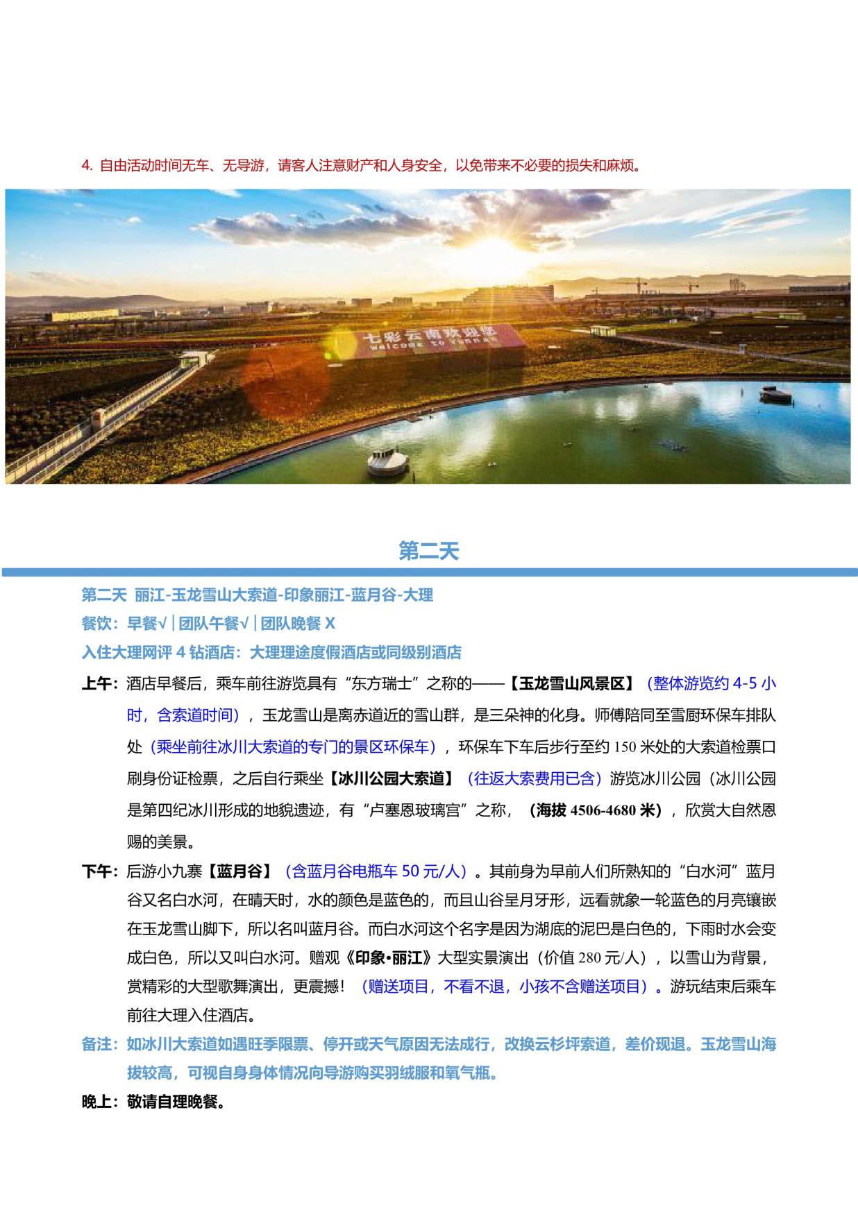 美景:麗江古城+玉龍雪山大(dà)索道+印象麗江+藍月穀+喜洲(zhōu)古鎮+大理古城+虎跳峽+壇(tán)城+ 獨克宗+普達措森林公園+束河古鎮+黑龍潭公園 (若行(háng)程(chéng)中行程景點未安排(自願取消或不可抗力除外),我司會立即核(hé)實協調為客戶 安排行程內披露的行程(chéng),如無法安排,有門票景點費用退一賠一)
