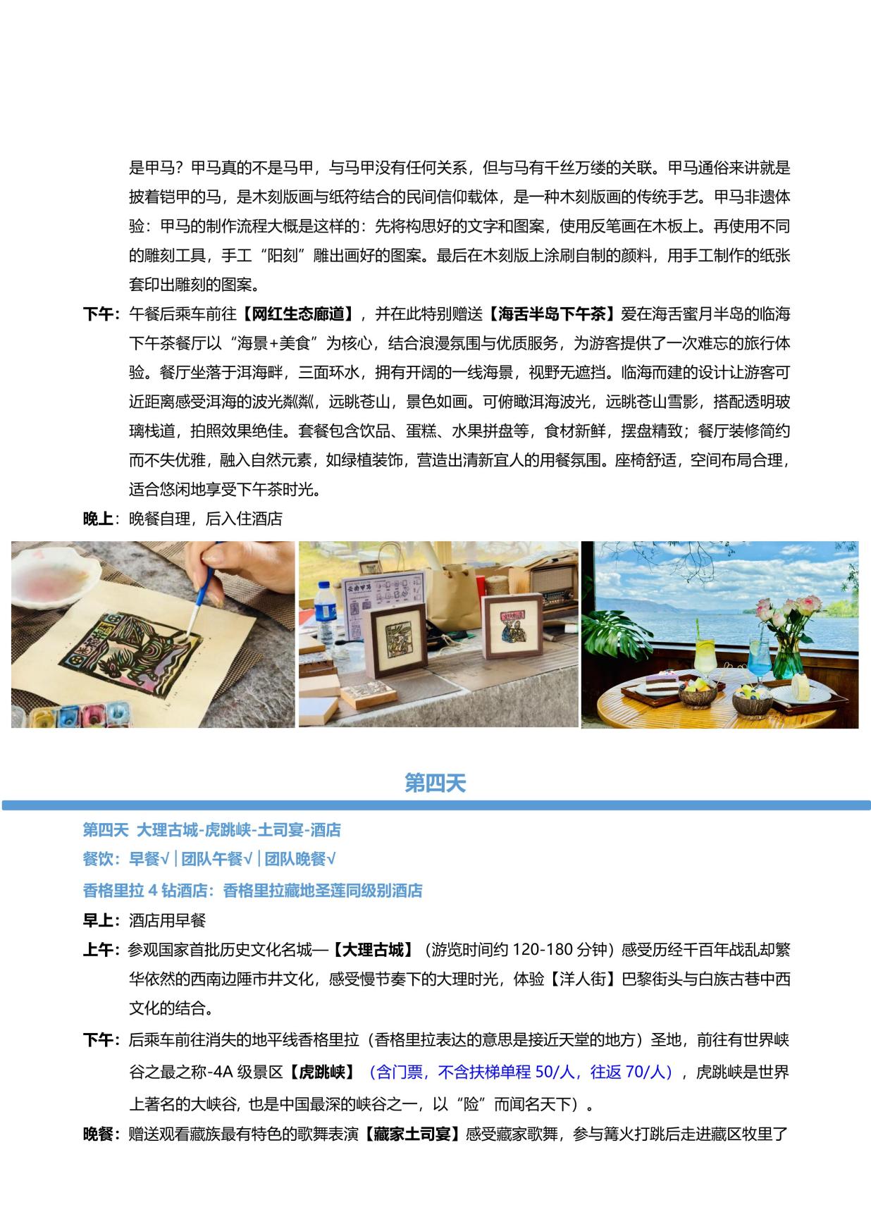 贈送:贈觀價(jià)值 280 元《印象·麗江》大型實景演(yǎn)出+喜洲甲馬體驗+海(hǎi)舌半島下午茶 (若行程中贈送點未安(ān)排(自願取消或不可抗力除外),我司會立即核實協調為客戶安 排行程內(nèi)披露的行程,如無法安(ān)排,有門(mén)票景點費用退一賠(péi)一)