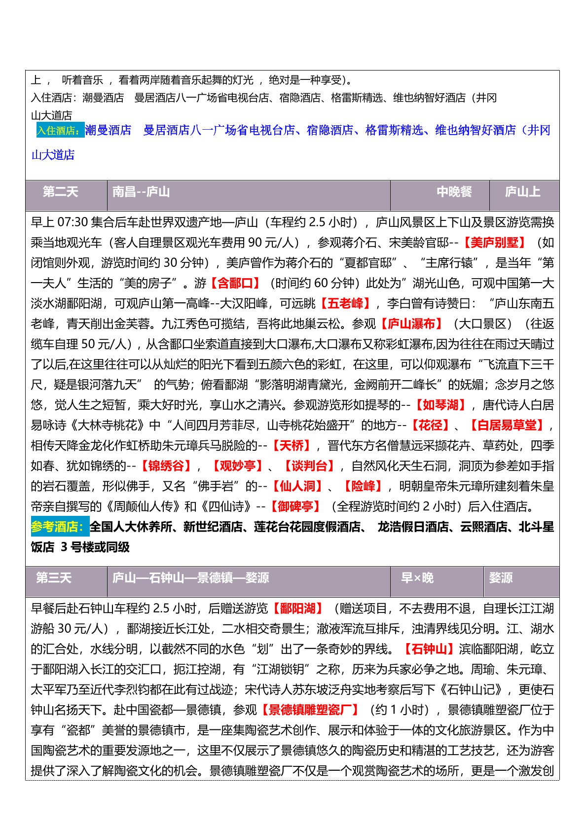 ☆☆精華景點:望廬山瀑布、景德鎮雕塑瓷廠(chǎng)、白牆黛瓦徽派建築古村落篁嶺、夜(yè)遊望仙穀,夢回唐風 宋骨,成全屬於你的仙俠夢; ☆☆特色團(tuán)餐:廬山三石(shí)宴、婺源徽宴,品(pǐn)地道贛菜,驚(jīng)豔您的味蕾!