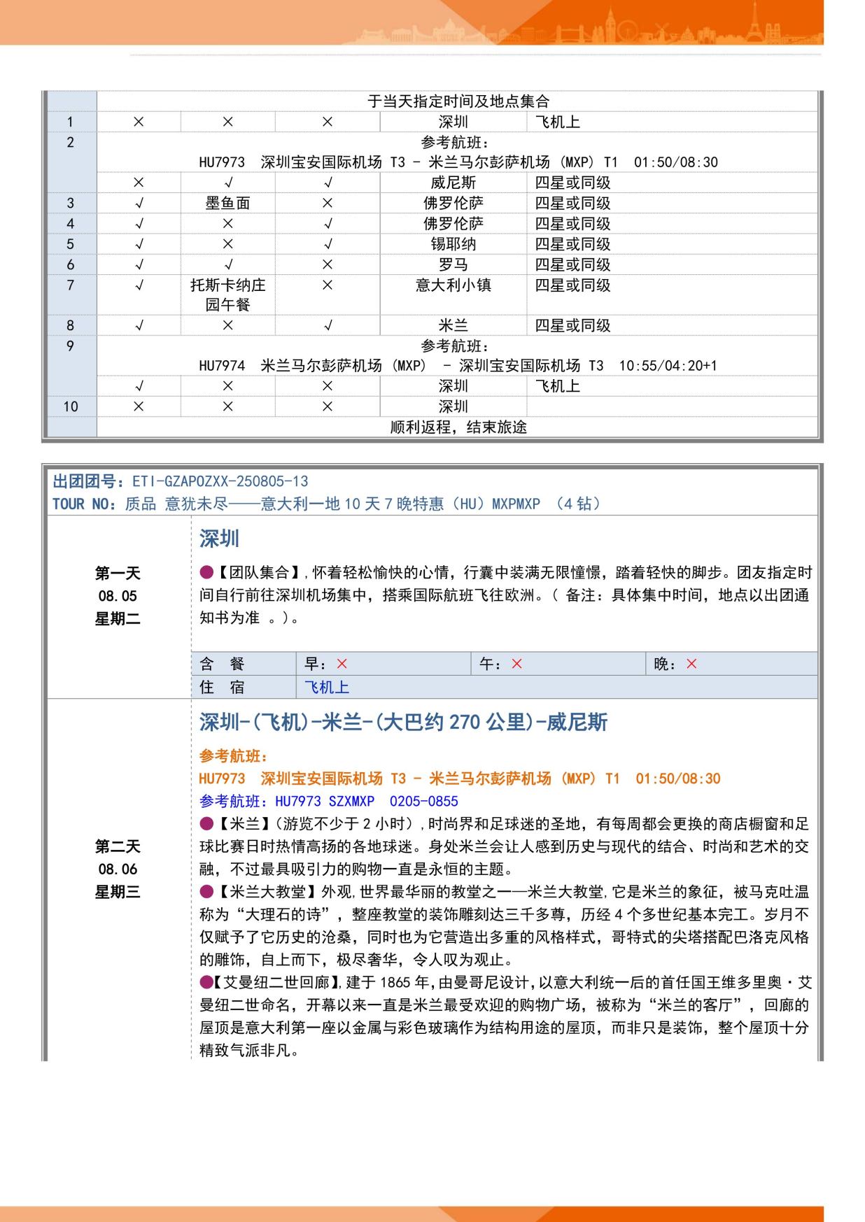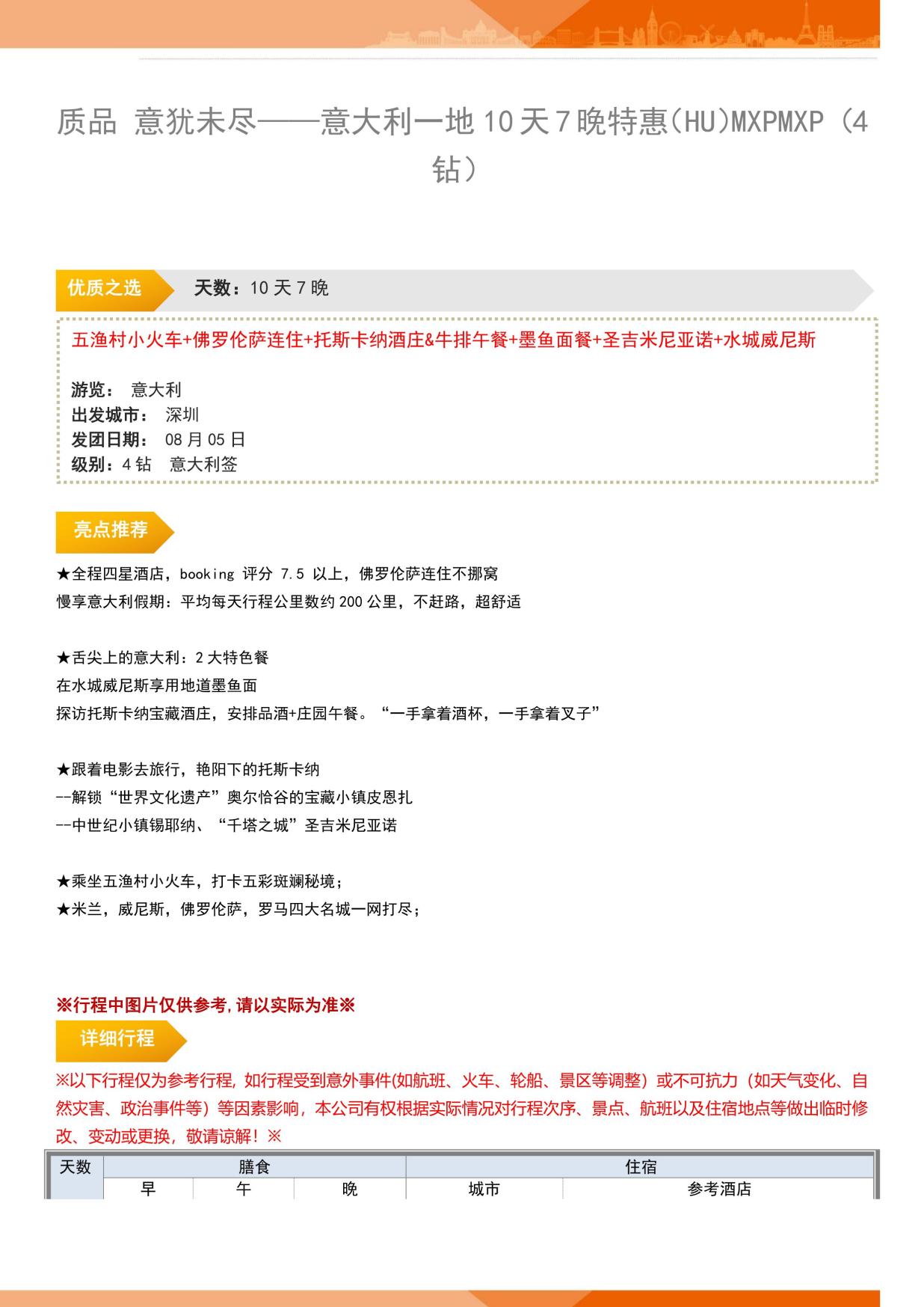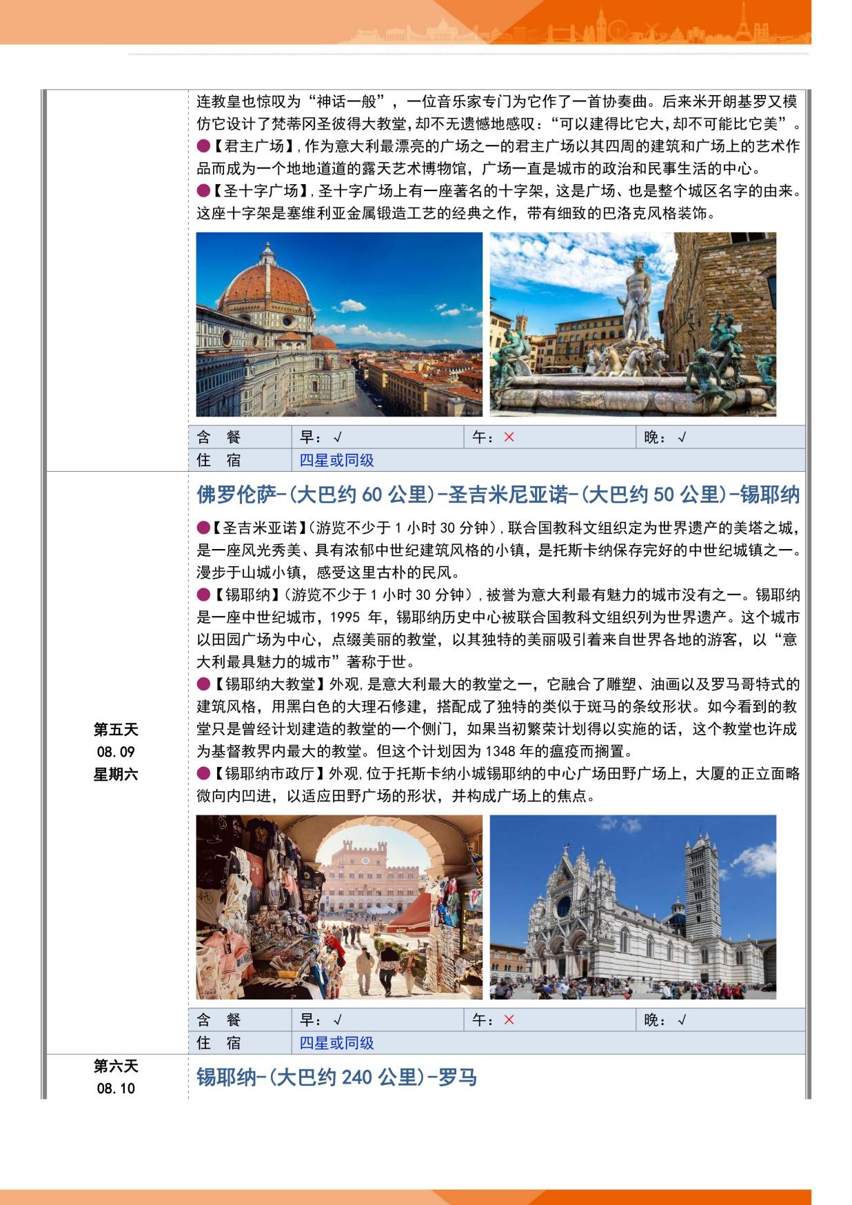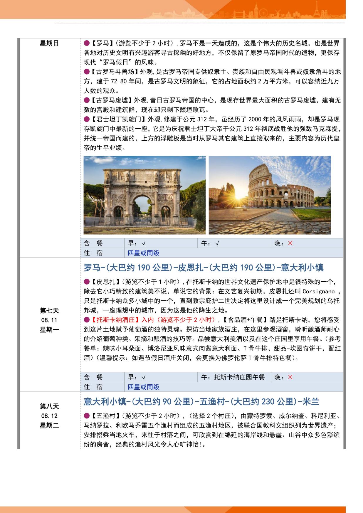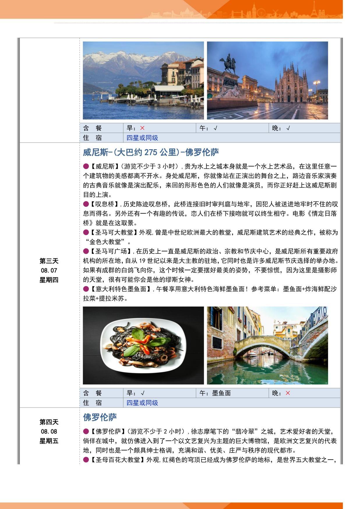 2.用餐:行程注明所含的 7 個早餐,1 餐海鮮墨魚麵餐(cān),1 餐托(tuō)斯卡納莊園牛排餐,另有 6 個正(zhèng)餐(以中式六菜一湯為主(zhǔ),不含酒(jiǔ)水(shuǐ)), 8-10 人一桌,或根據餐廳提供桌型安排就餐(cān)座位;無(wú)法安排中餐(cān)的城市將安排當地餐或退餐費,所有餐食如自動放棄,款項恕不退還; 如果在全團協議(yì)下同(tóng)意更改為風味餐,不退正常團(tuán)餐(cān)費用;