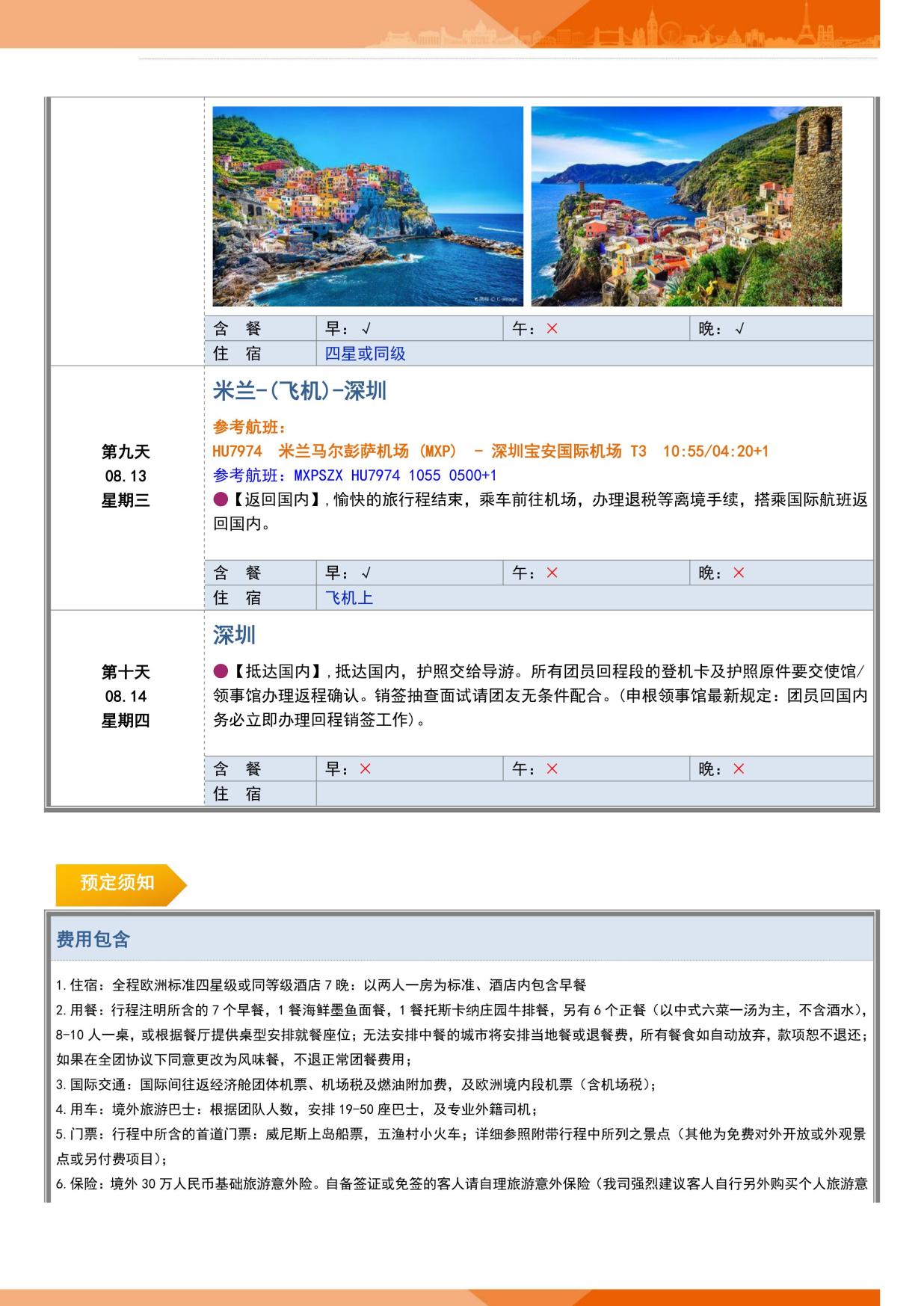5.門票:行程中所含(hán)的首道門票:威尼斯上島船票,五漁村(cūn)小(xiǎo)火車;詳細參照附帶行程中所列之景點(其他(tā)為免費對外開放或外觀景 點或另付費項目);