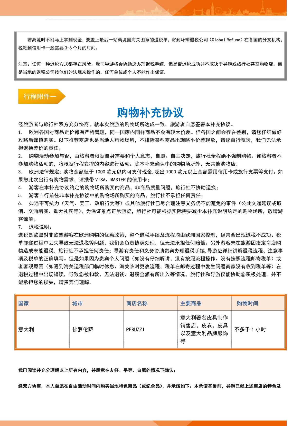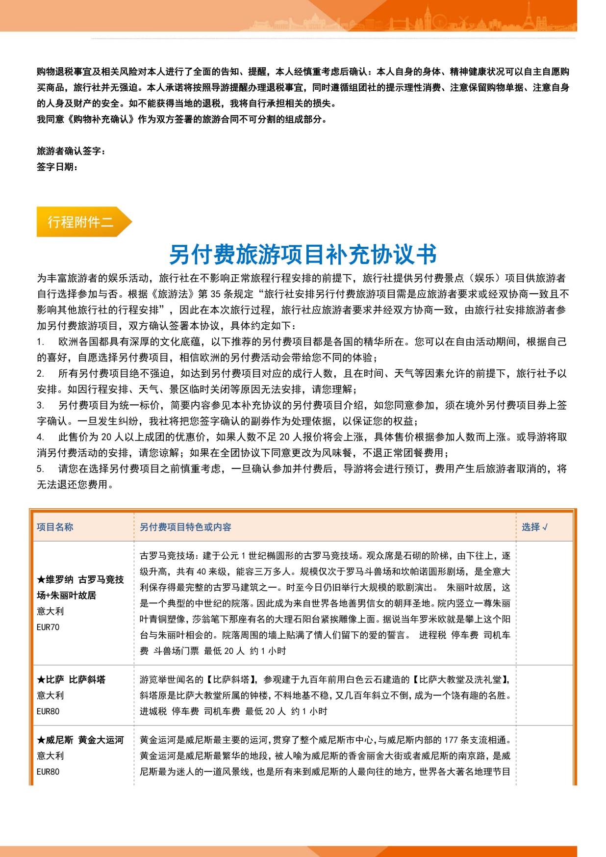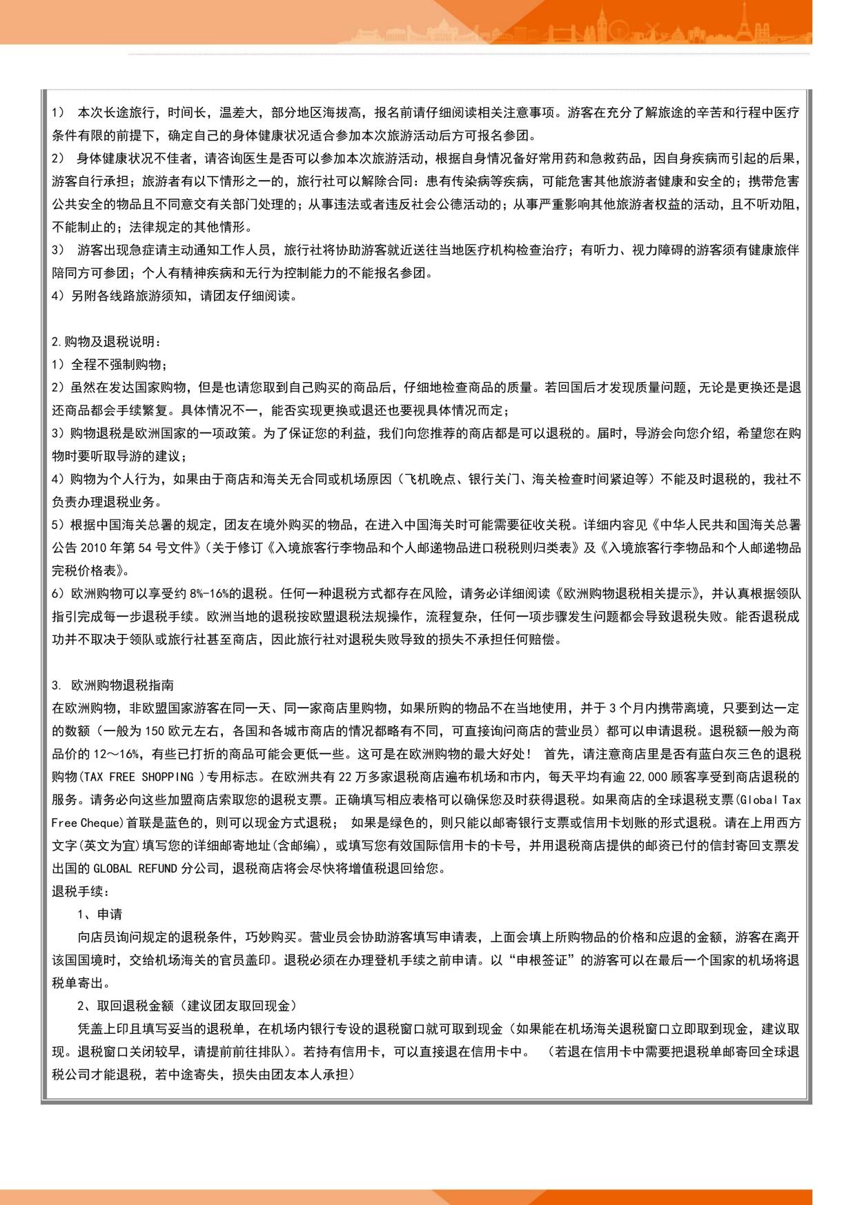 3.官導服務費:因境外目的地有小費(fèi)文化,團友須另付歐洲境內中文導遊和司機服務費;為了感(gǎn)謝歐洲各地有當地(dì)官方導遊講解及熱 忱服務(例如:盧浮宮,羅馬,威尼斯等等),請另付上小費 EUR 1/人。