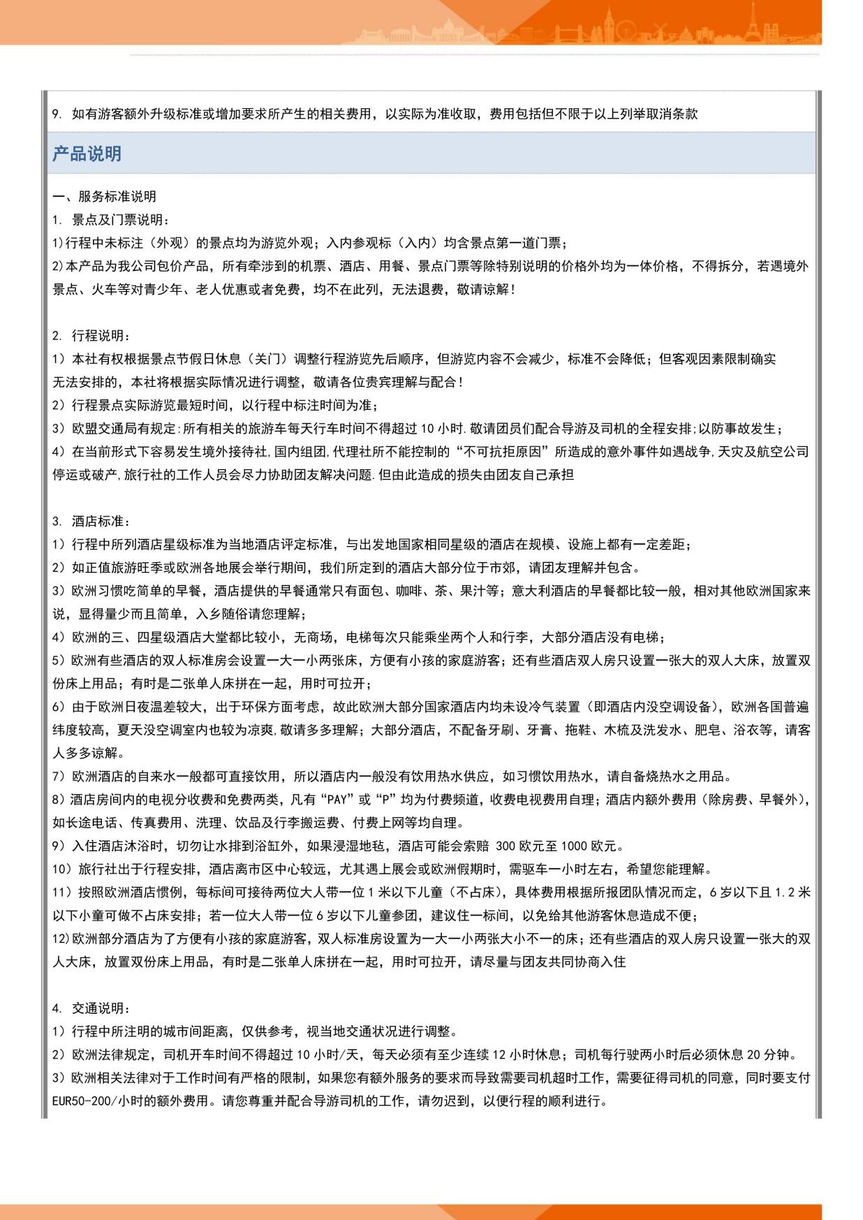 1.住宿:全(quán)程歐洲標(biāo)準四星(xīng)級或(huò)同等(děng)級酒店 7 晚:以兩人一(yī)房為標準、酒店內包含早(zǎo)餐