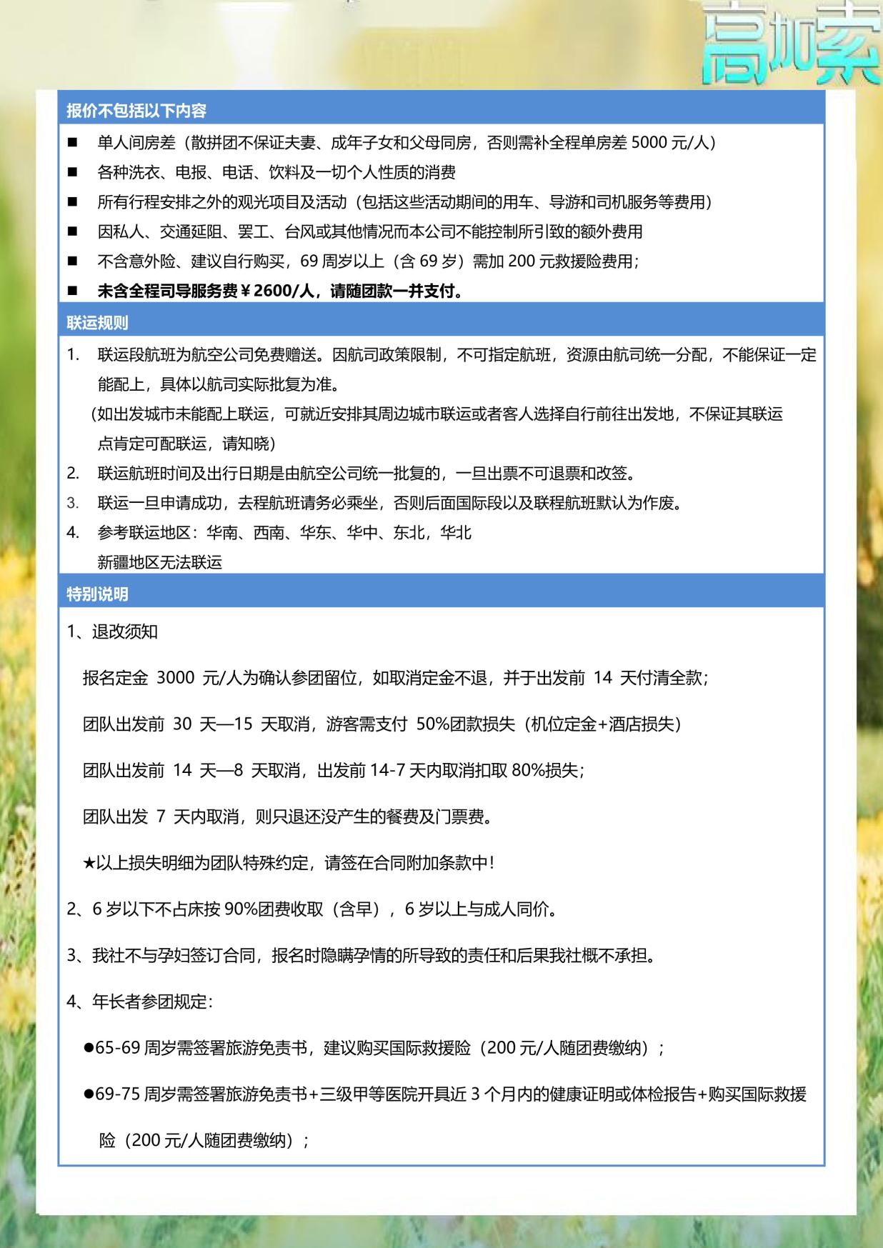 未含全程司導服務費¥2600/人,請隨團款(kuǎn)一並支付。