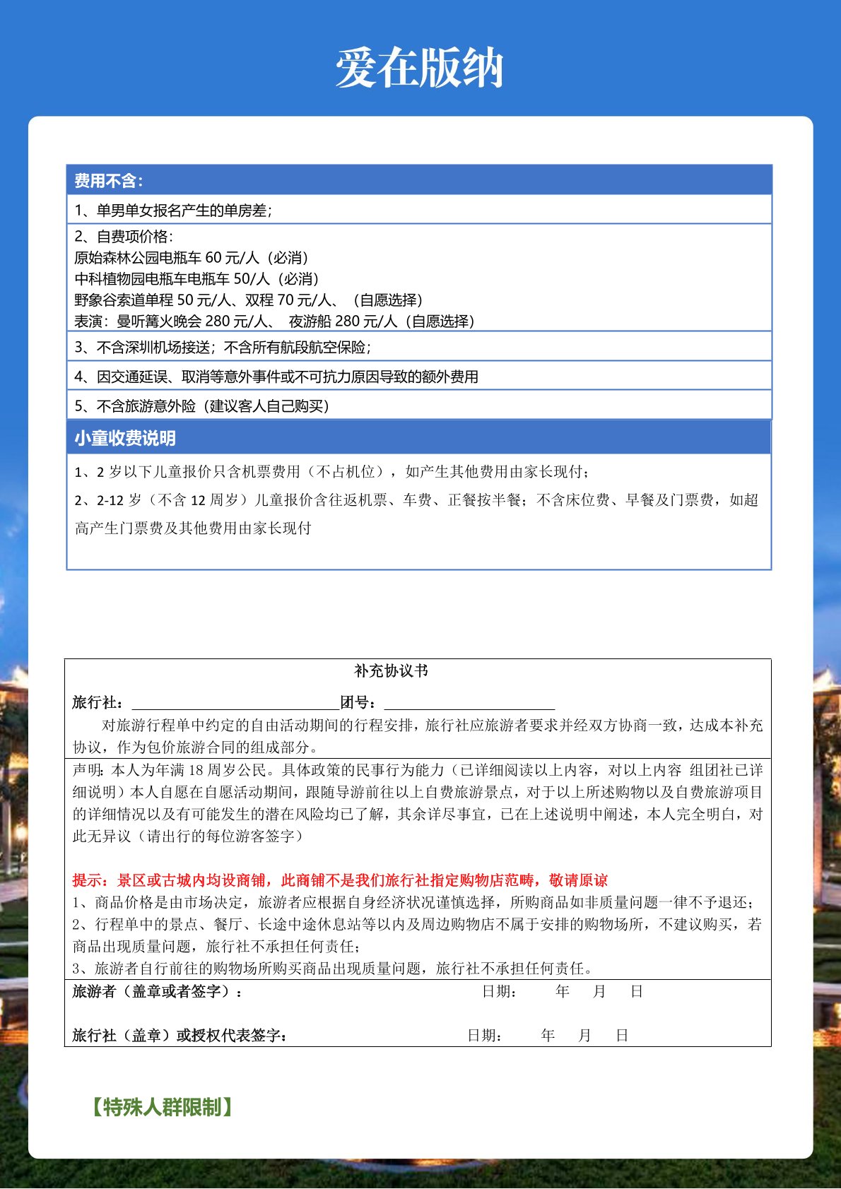 (本線(xiàn)路已經按雲南(nán)旅行社門票(piào)政策核算,所有的門(mén)票優惠減免無費用可退),不含景點(diǎn)小門票,個人消費及行(háng)程上自理的項目。贈送項(xiàng)目如因特殊(shū)原因不能成行,不做退款。