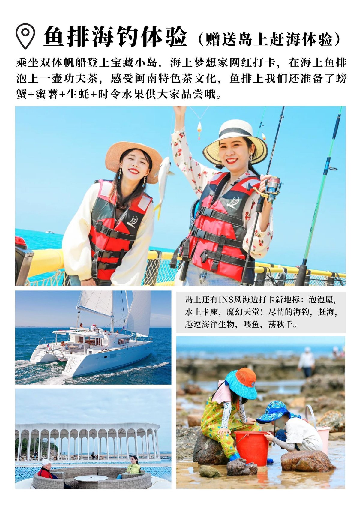 景點門票 上卡座,魔(mó)幻天堂,海釣(diào),趕海,提供魚竿魚餌,收獲免費加工,趣逗(dòu)海洋生(shēng)物,喂魚,蕩秋(qiū)千(qiān)....海
