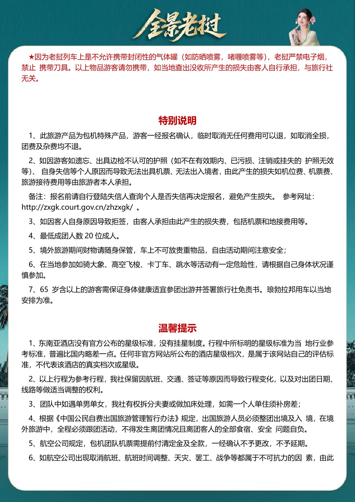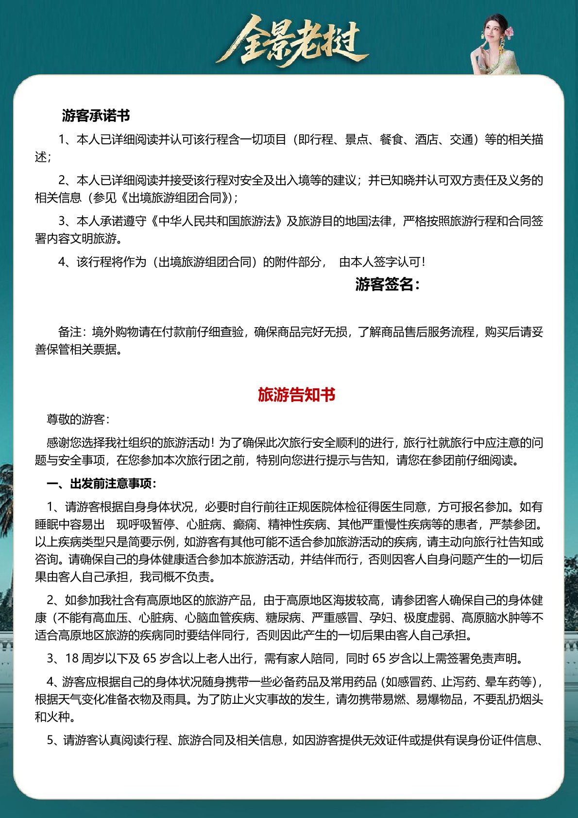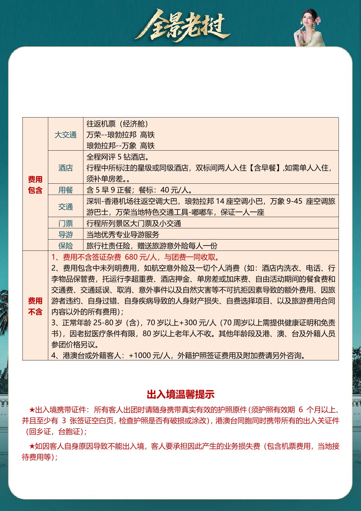 保險 旅行社責任(rèn)險,贈送旅遊意外險每人一份 1、費用不含簽證雜費 680 元(yuán)/人,