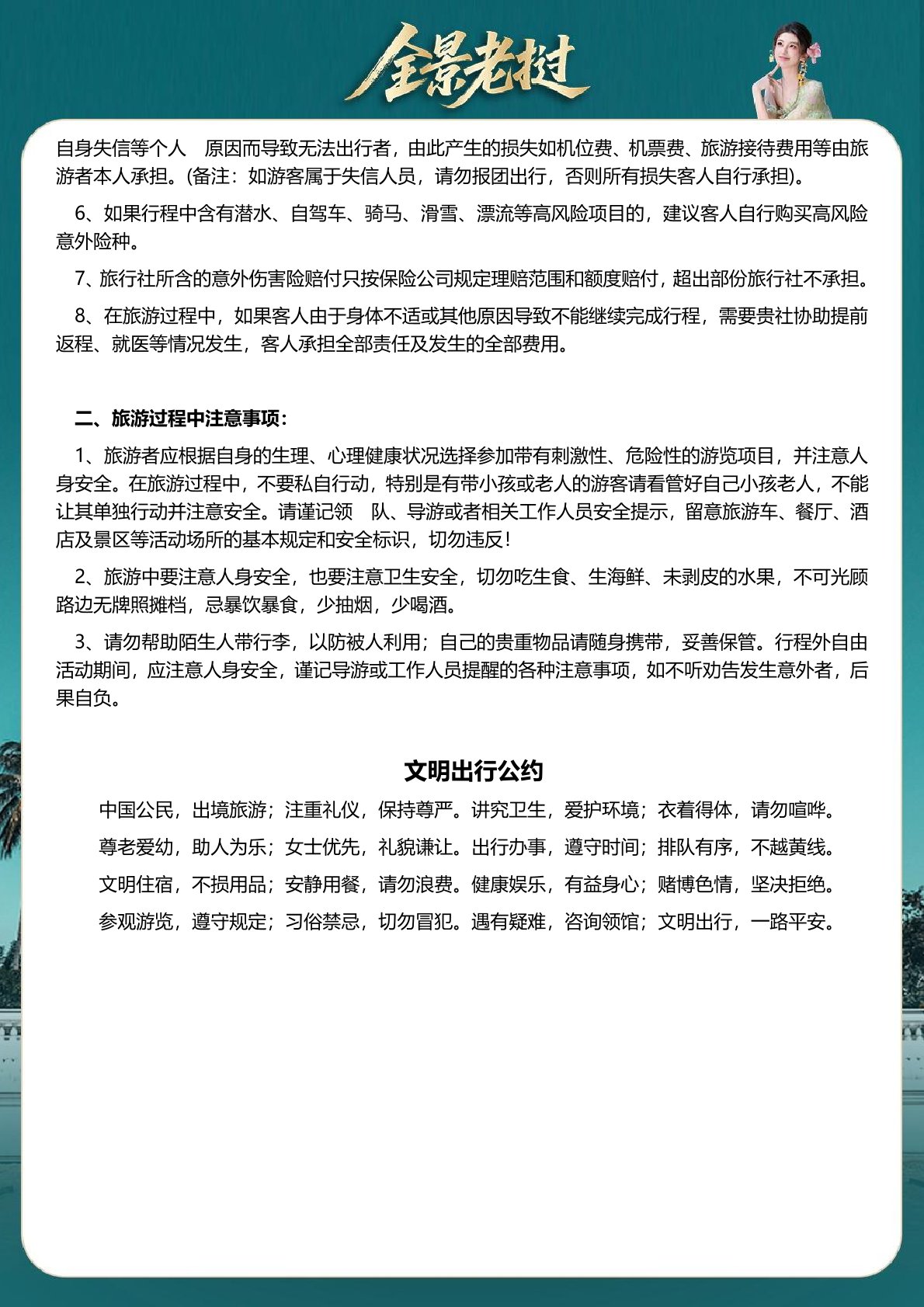 費用 遊者違約(yuē)、自身過錯、自身疾(jí)病導致的人身財產損(sǔn)失、自費選擇項目、以及旅遊費用合同