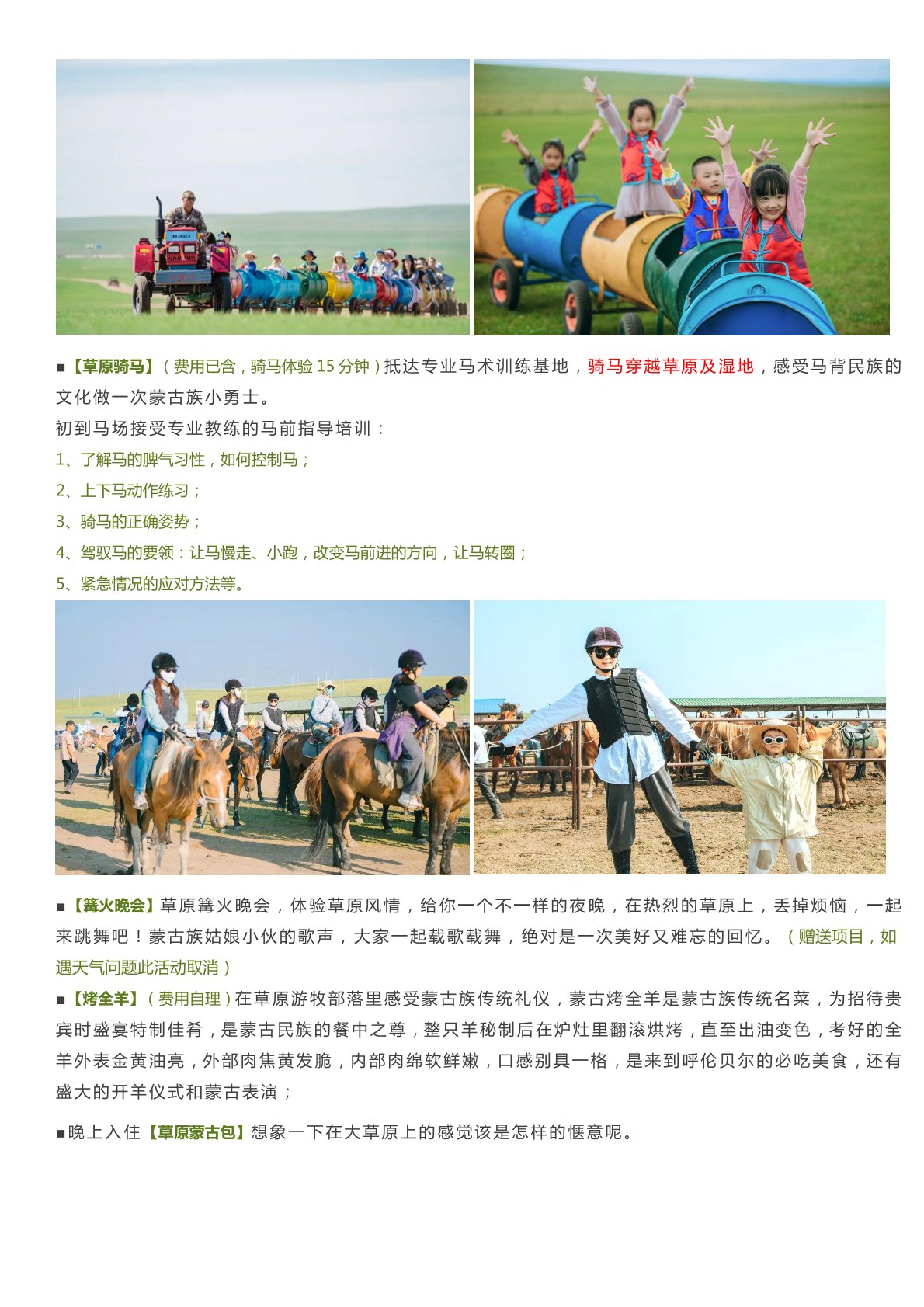 兒童各類特色體驗:莫(mò)日格勒景交+航拍+風箏+濕地+壓花+列巴+畫套娃+白樺林+樺樹貼(tiē)+牧戶+小火車(chē)+騎馬(mǎ)+巴爾虎