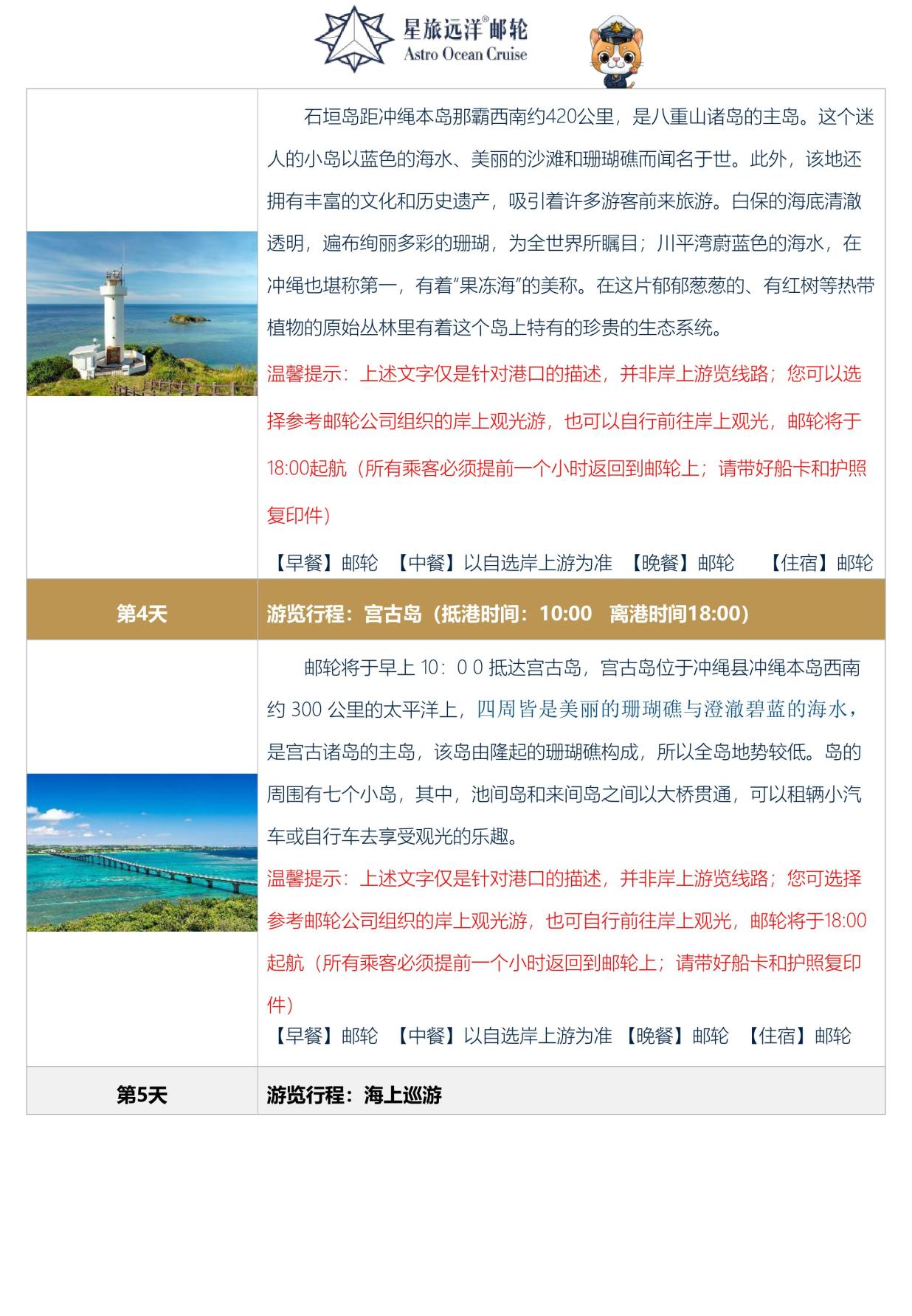 4、日本觀光稅費:根據日本政府的征稅(shuì)規定, 凡通過船(chuán)舶公司或航空公司前往日本觀光的國際旅客 需支(zhī)付日本觀光稅費7美(měi)金/人(2周歲以下嬰兒免收)(此費用將由船上收(shōu)取,無論是否參與岸上觀 光,都應繳納。)