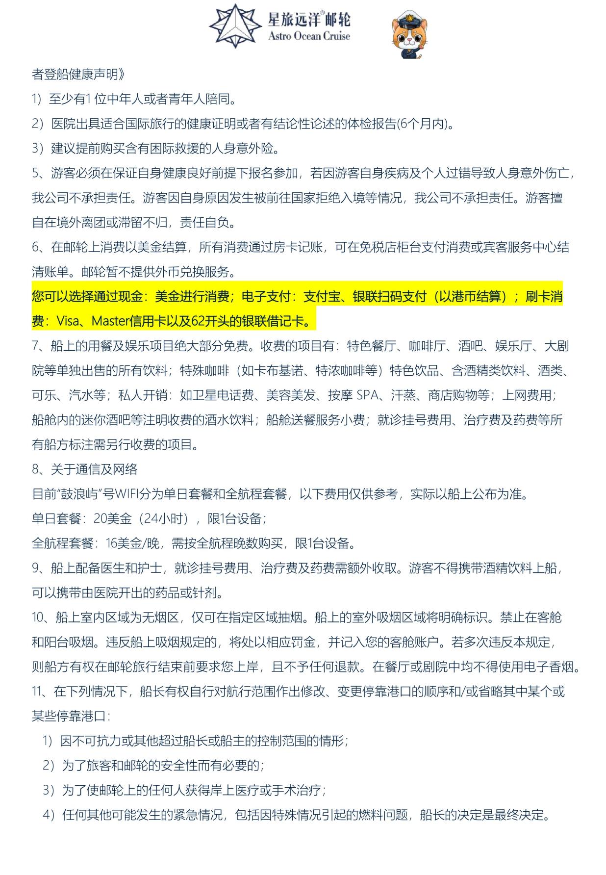 6、單人入住需要支付200%的船票費(fèi)用(yòng);