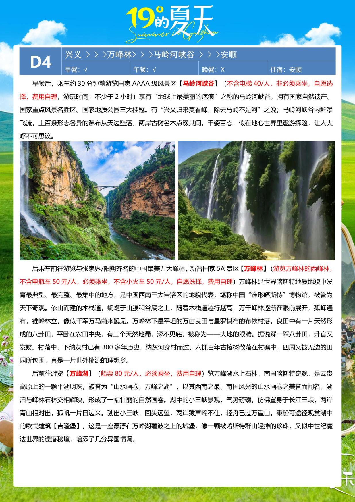 2、自願選擇景交:海坪千戶彝寨觀光車 20 元,峰林布依電(diàn)瓶車 20 元/人,萬峰林小火車 50 元/人、馬嶺河峽穀電 梯 40 元/人。 3、個人(rén)消費、行(háng)程(chéng)以外費(fèi)用、旅(lǚ)遊意外險。由於不可抗拒原(yuán)因而需要變更行程(chéng)時產(chǎn)生的(de)費用(包括但不限於自然 災害等不可抗力(lì)因素、航班延誤或取(qǔ)消、車輛故障、交通意外等)
