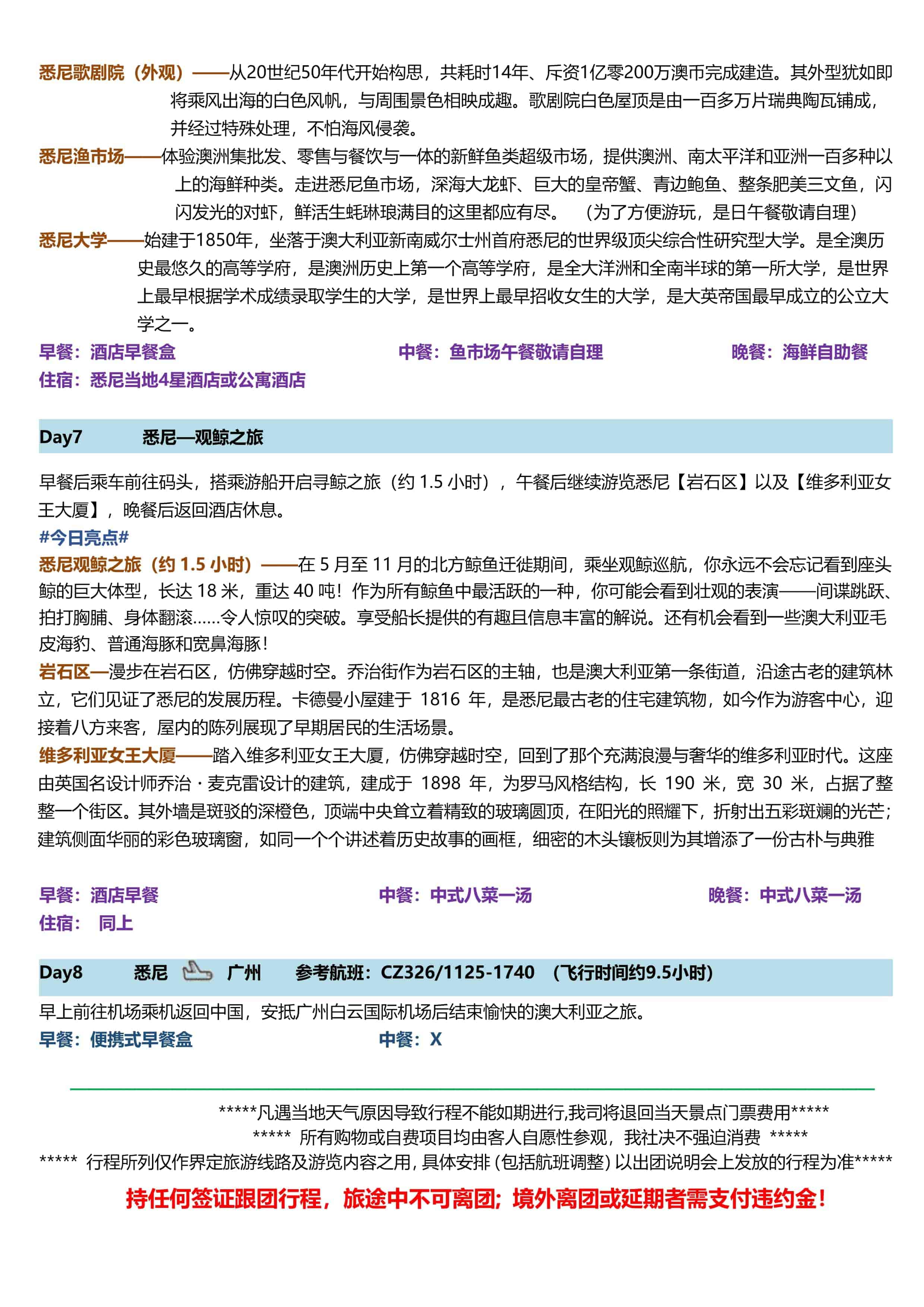 D7 | 悉尼 | 悉(xī)尼觀鯨之旅、岩石區、維(wéi)多利亞女王(wáng)大廈 | 早餐:酒店早餐 午餐:中式八菜一湯 晚餐:中(zhōng)式八菜一湯 | 悉尼當地四星酒店或公寓 |