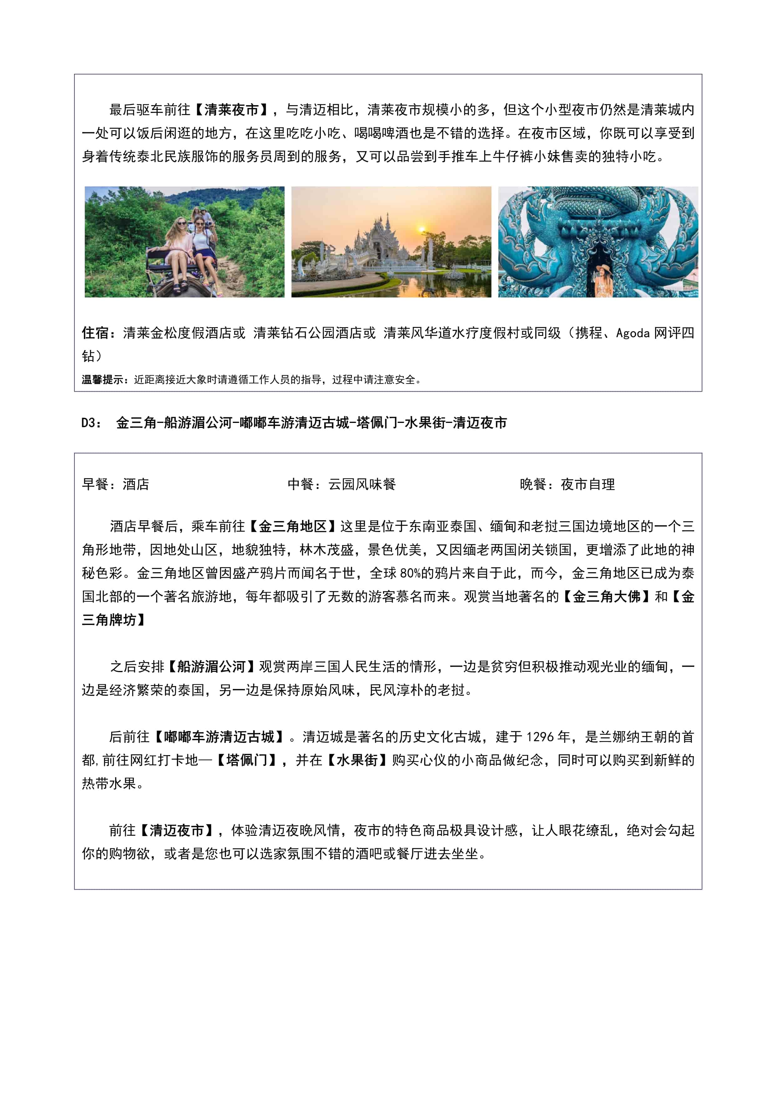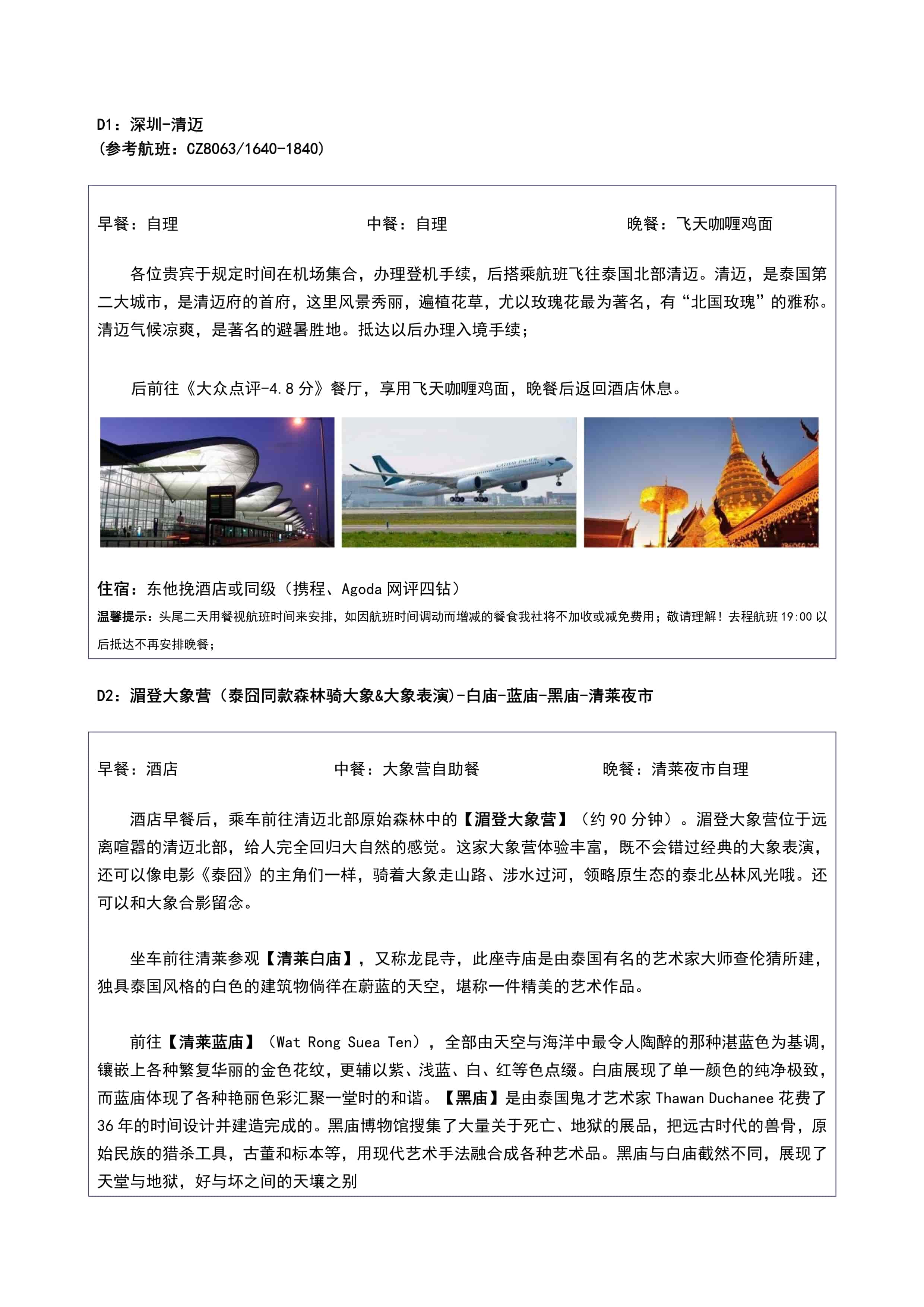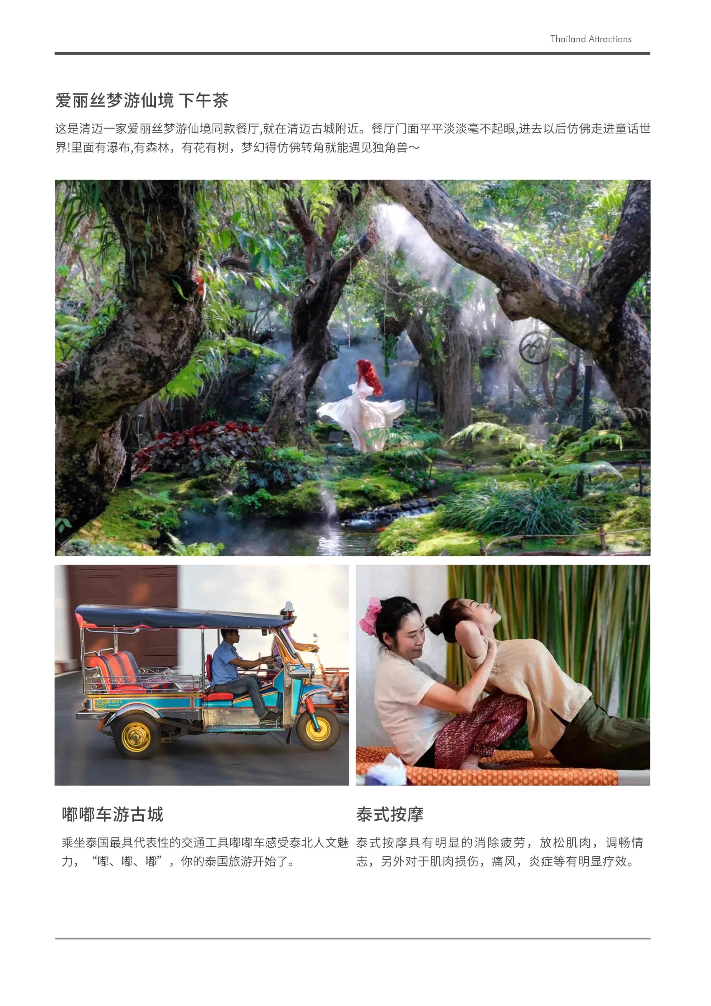 行程亮點 | 清(qīng)邁最大的大象訓練營、《泰囧(jiǒng)》同款(kuǎn)—湄登大(dà)象營; 特別安排愛麗絲夢遊仙境下午茶,享受(shòu)清邁慢時光; 清邁網紅打卡地—塔佩門;嘟嘟車遊清邁古城; 清萊三大網紅打卡地:白廟、藍廟(miào)、黑廟; 鄧麗君故事館-重溫昔日偶像的經典與故事特別安排一整天(tiān)清邁自由活動! |