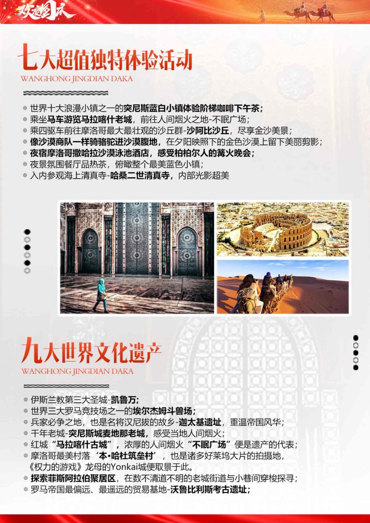 摩(mó)洛哥(gē)是一個神秘而美麗的穆斯林(lín)國家,當地景點(diǎn)受國家節日/宗教節日/政府媒體(tǐ)活動等多種因(yīn)素影響會臨時關閉,固(gù)行程中所列景點如遇關閉為正(zhèng)常現象,因以上情況(kuàng)未能參觀到景點不(bú)做賠償,敬請理解。 |