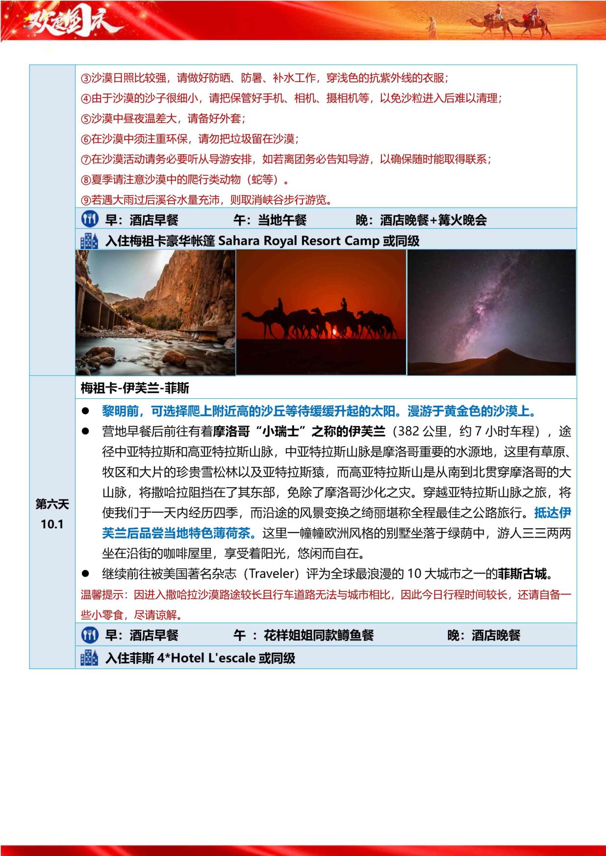 溫馨提示(shì):因進入撒哈拉沙漠路途較長且行車(chē)道路無法與城市相比,因此今日(rì)行程(chéng)時間較長,還請自備一 些小零食,盡請諒解。 |