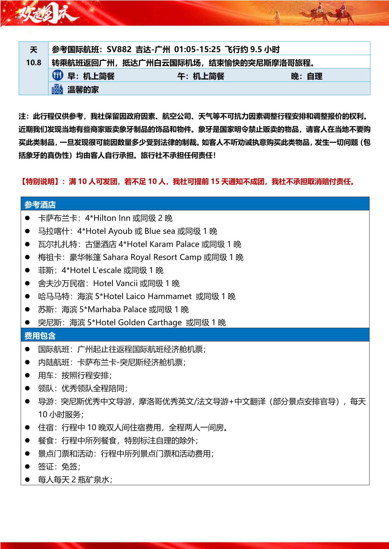 10.8 | 轉乘航班返回廣州,抵達(dá)廣州白雲國際(jì)機場,結(jié)束(shù)愉快的突尼斯摩洛哥旅程。 |