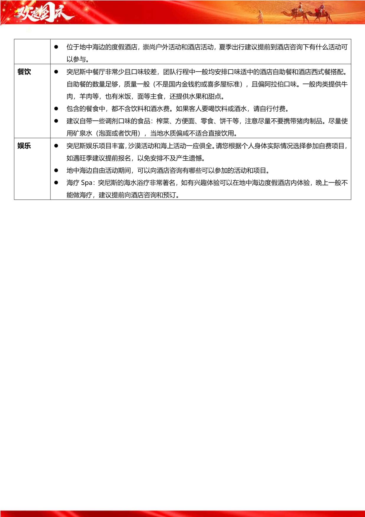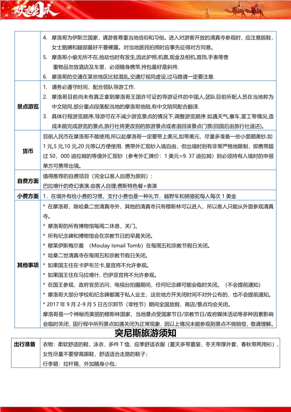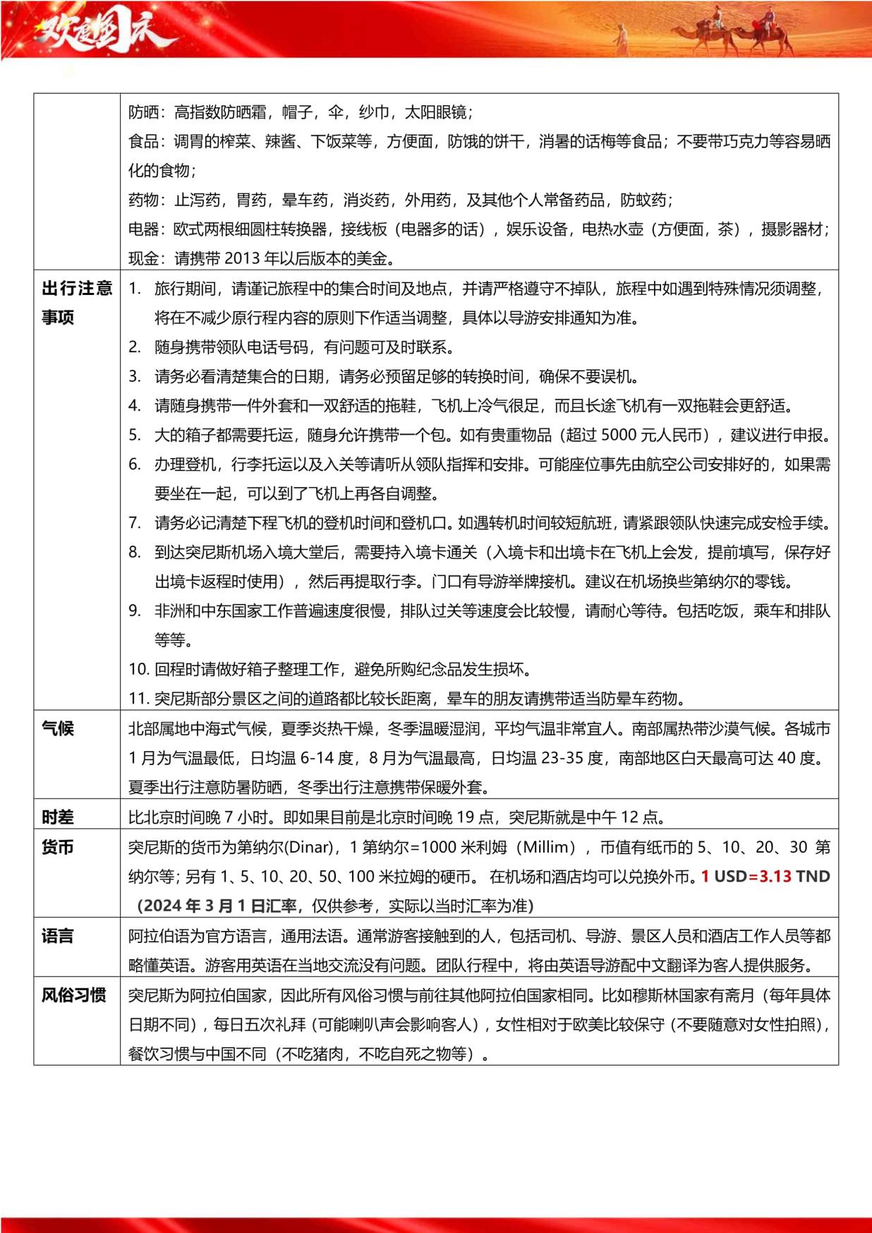 出行(háng)注(zhù)意(yì)事項(xiàng) | 旅行期間,請謹記旅程中的集(jí)合時間及(jí)地點,並請嚴格遵守不掉隊,旅程中如遇到特殊情況須調整, 將在(zài)不減少原(yuán)行(háng)程內容的原則下作適當調整,具體以導遊安排通知為準(zhǔn)。 隨身攜帶領(lǐng)隊電話號碼,有問題可及(jí)時聯係(xì)。 請(qǐng)務必(bì)看清楚(chǔ)集合的日期,請務必預留(liú)足夠的轉換時間,確保不要誤機。 請隨身攜帶(dài)一件外套和一雙舒(shū)適的拖鞋(xié),飛機上(shàng)冷氣很足,而且長途飛機有(yǒu)一雙拖鞋會更舒適。 大的箱子都需要托運,隨身允許攜帶一個包。如有貴重物品(超過 5000 元人民幣),建議進行申(shēn)報。 辦理(lǐ)登機,行李托運以(yǐ)及入關等(děng)請聽從領隊(duì)指揮和安排。可能座位事先由航空公司安排好的,如(rú)果需(xū) 要坐在一起,可以到了飛機上再各自調整。 請務必記清楚下程飛機的登(dēng)機時間和登機口。如遇轉機時間較短航班,請緊跟領隊快速完成安檢手續(xù)。 到達突尼(ní)斯機場入境大堂後,需要持入境卡通關(入境卡(kǎ)和出境卡在飛機上會發(fā),提前填寫,保存好(hǎo) 出境卡返程時(shí)使用),然(rán)後再提取行(háng)李。門口有導遊舉牌接機。建議在機場換些第納爾的零錢。 非洲和中東國家工作普遍速度很(hěn)慢,排隊過關(guān)等速度會比(bǐ)較慢,請耐心等待。包(bāo)括吃飯,乘(chéng)車和排隊 等(děng)等。 回程時請(qǐng)做好箱子整理工作,避免所購紀念品(pǐn)發生損壞。 突尼斯部分景區(qū)之間的道路都比較長距離,暈車的朋友請攜帶適當防暈(yūn)車藥物。