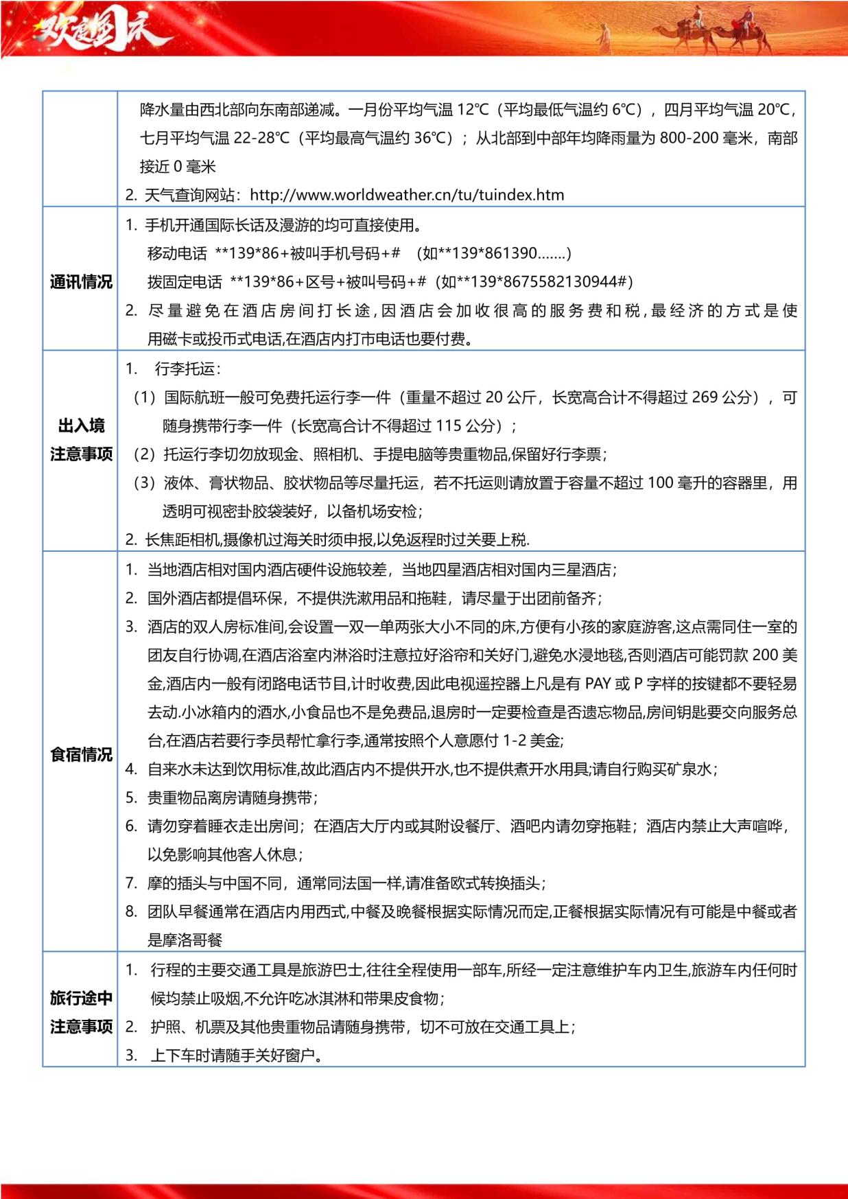 小費方麵 | 1.在境外有給小費的習慣(guàn),支付小費也是一種禮節,越野車和騎駱駝每人每次 1 美金 |