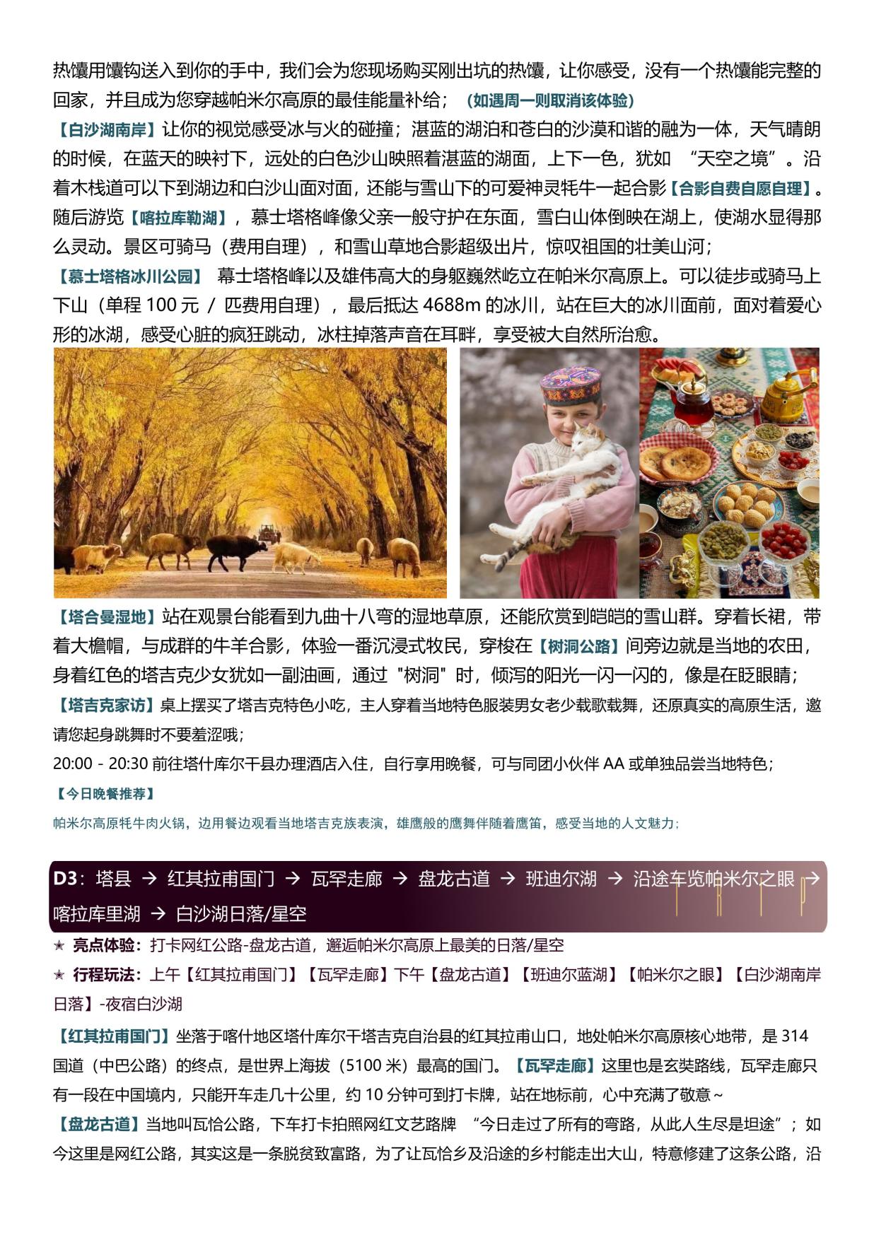 2.七大場景(jǐng)設計,旅行情緒價值拉滿; a:參加一場當地人的維吾(wú)爾族婚(hūn)禮,能歌善舞 儀式感(gǎn)具象化 b:現場觀看製作饢,吃一口熱饢,像當地人一樣,沒有一個熱饢能完整回家; c:輕奢 Glamping 盲盒,即刻與美景碰杯暢(chàng)飲,當地維吾爾族糕(gāo)點感受當地美(měi)食文化; d:征服 4688 慕士塔格冰川,儀式感勳(xūn)章及時獎勵,做自己人生的 MVP 為您(nín)定製專屬高光時(shí)刻; e:探訪(fǎng)郵局郵寄明信片,旅行(háng)的(de)獲得感郵寄給遠方的(de)他們或(huò)未(wèi)來的自己; f:紅(hóng)其拉甫國門 瓦罕走廊 貼心(xīn)準備小道具(jù),讓愛國更(gèng)具象化; g:巴鐵集市,感受一(yī)場來自中國最西段的跨國貿易 Live;
