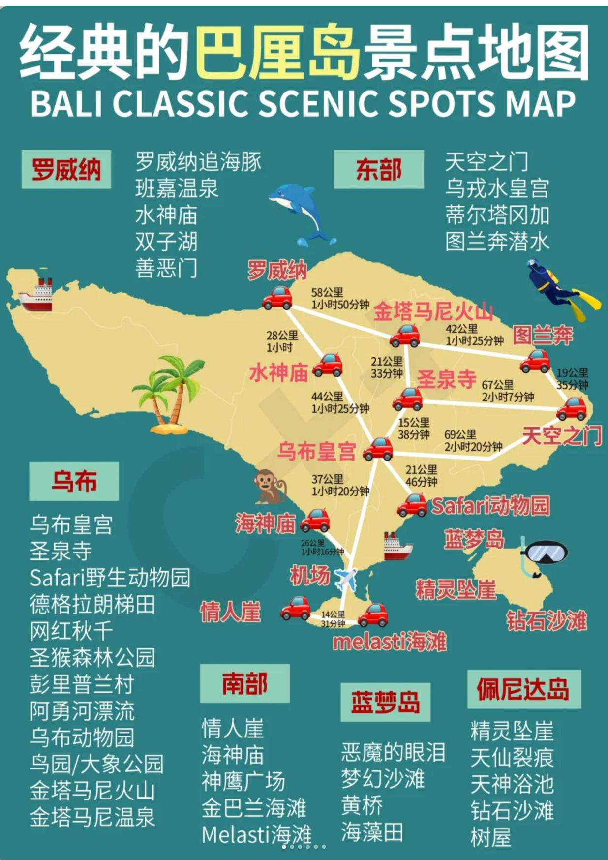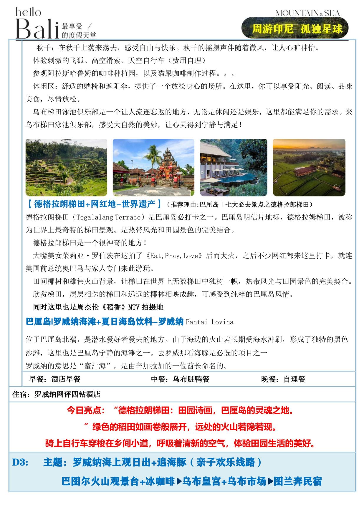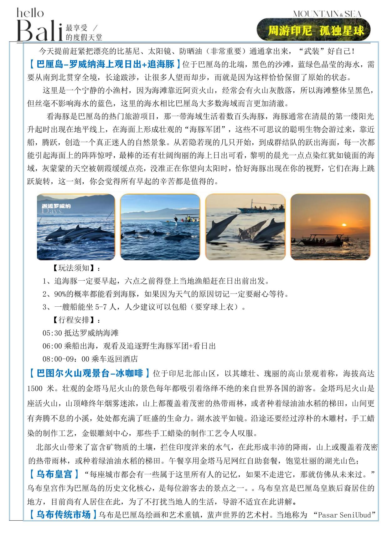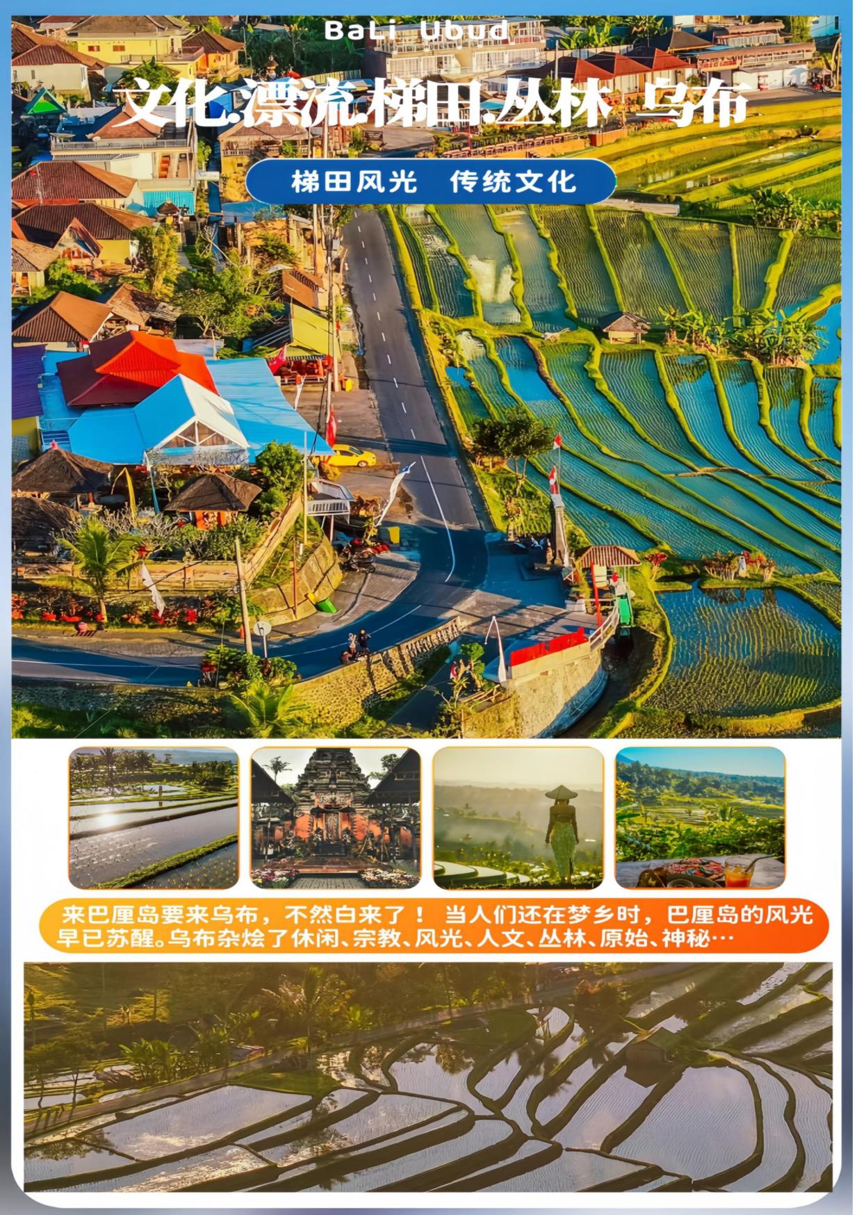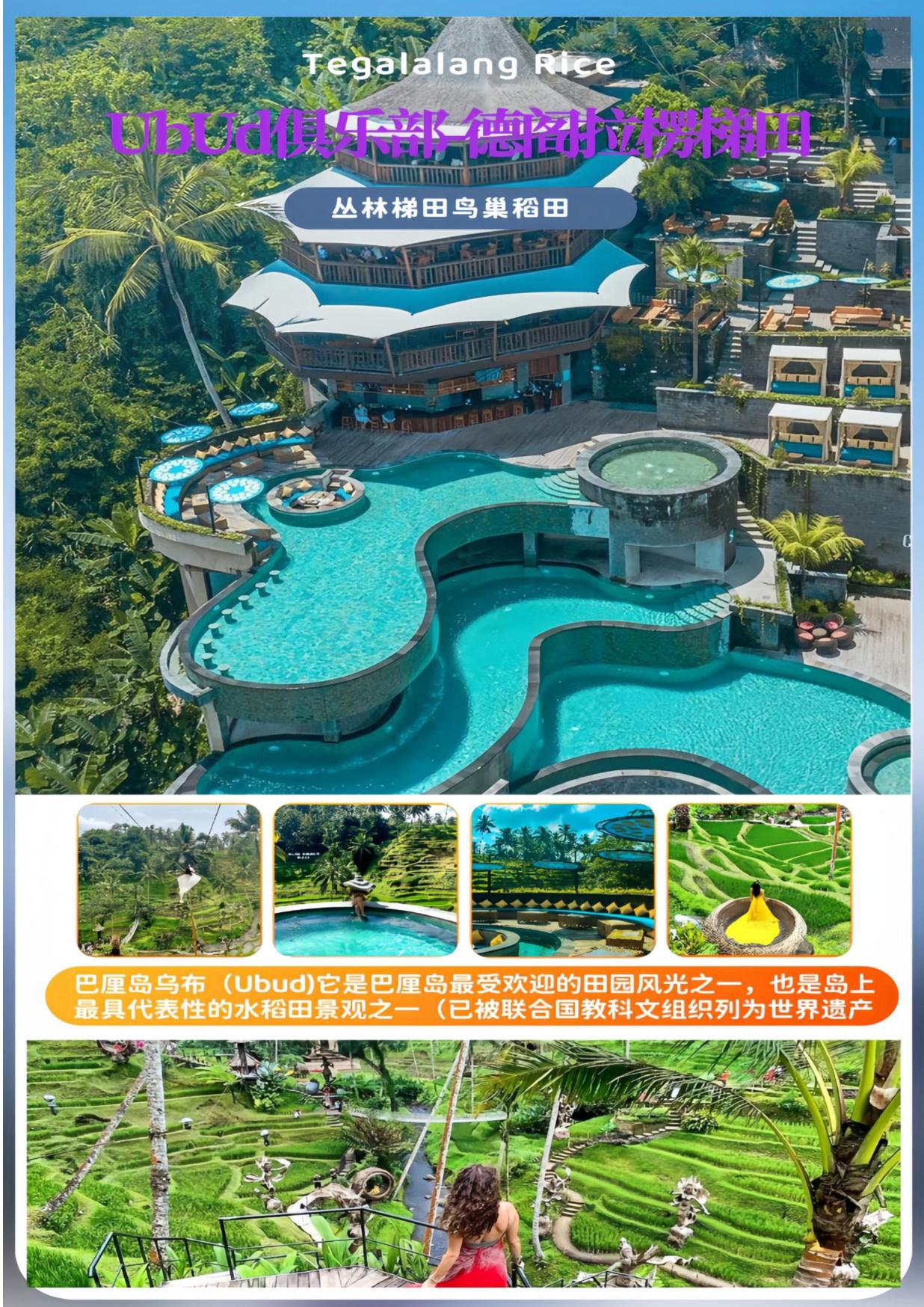 精華景點: 網紅打卡: 金巴蘭海(hǎi)灘+最美日落 | 以其壯觀的海上(shàng)日落美景而聞名 羅威納追海(hǎi)豚 | 看海豚是巴厘島的熱門旅遊項目,在海麵上形成壯觀的“海豚軍團” 烏布 Alas Harum 梯田俱樂部 最受歡迎的梯(tī)田觀景俱樂部 巴杜爾火山 咖啡廳 火山之巔,美(měi)景無限——京打馬(mǎ)尼火山 德(dé)格拉朗梯田+網紅地-世界遺產 世界上最奇特的梯田景(jǐng)觀; 圖兮奔是岸潛,。 德格拉朗梯田+網紅地 巴厘島,一半野奢,一(yī)半浪漫,與屬你的天堂之旅
