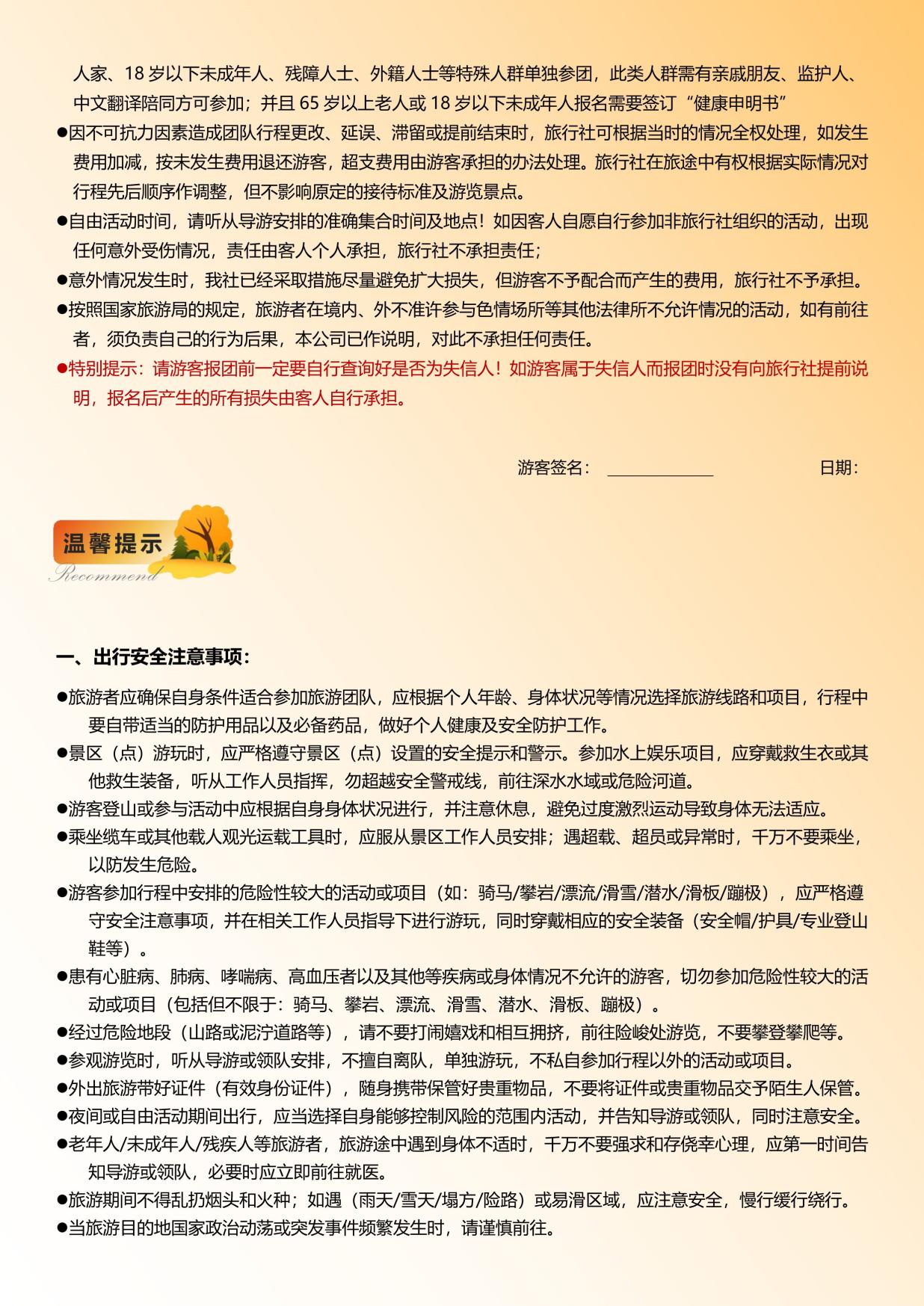 預訂(dìng)旅遊線路前,請務必(bì)確認行程日期、包含景點與交通方式,了解退改政策以防不測。核對個人信息準確無誤,關注天氣預報及當地風(fēng)俗習慣。提前支付定金(jīn)或全款,保留支付憑證。出行前(qián)查收電子票/確認(rèn)單(dān),並攜帶(dài)有效證件。如有疑問,及時(shí)聯係客服溝通。享(xiǎng)受旅程,安全第一,祝您旅途愉快!