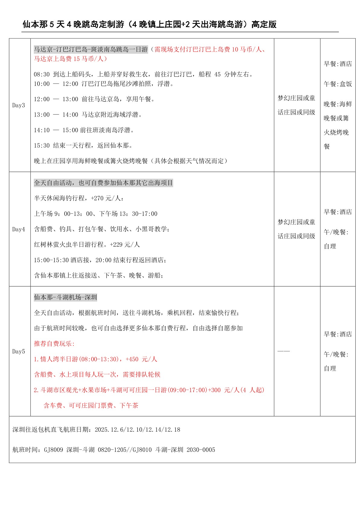1、獨家包機航班深圳直飛鬥湖、位置有保障、黃金飛行時間、免轉機、免熬(áo)夜;
