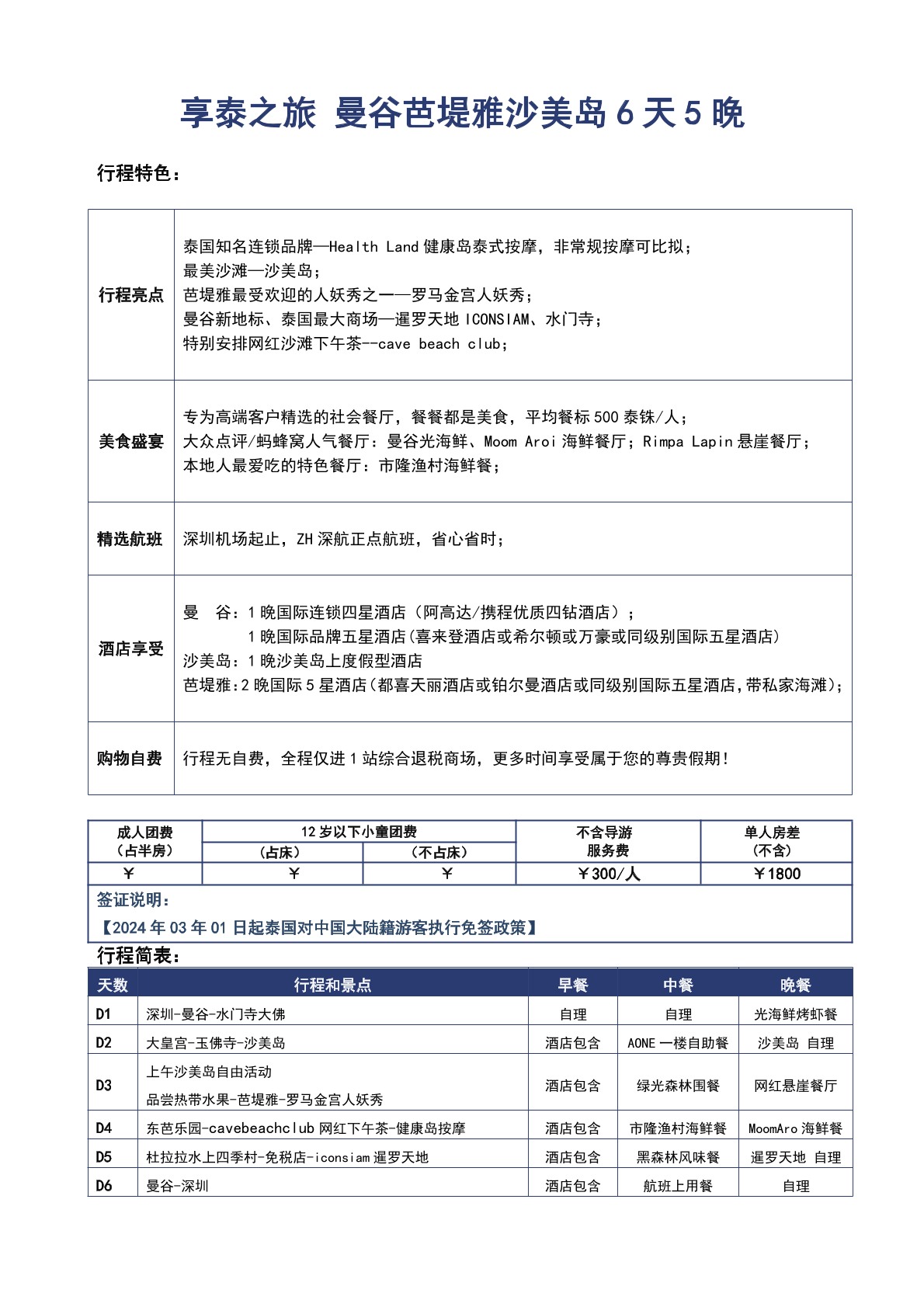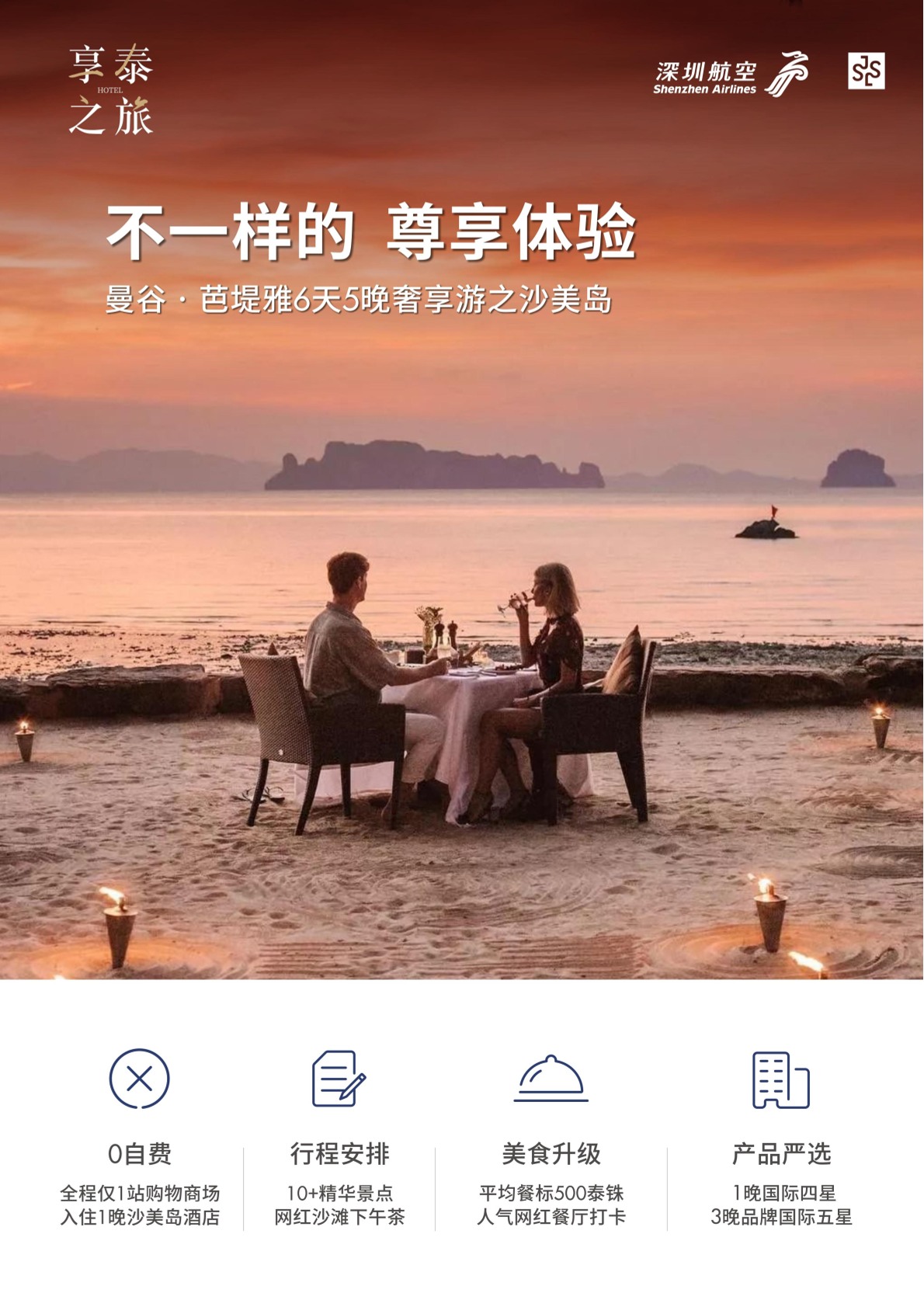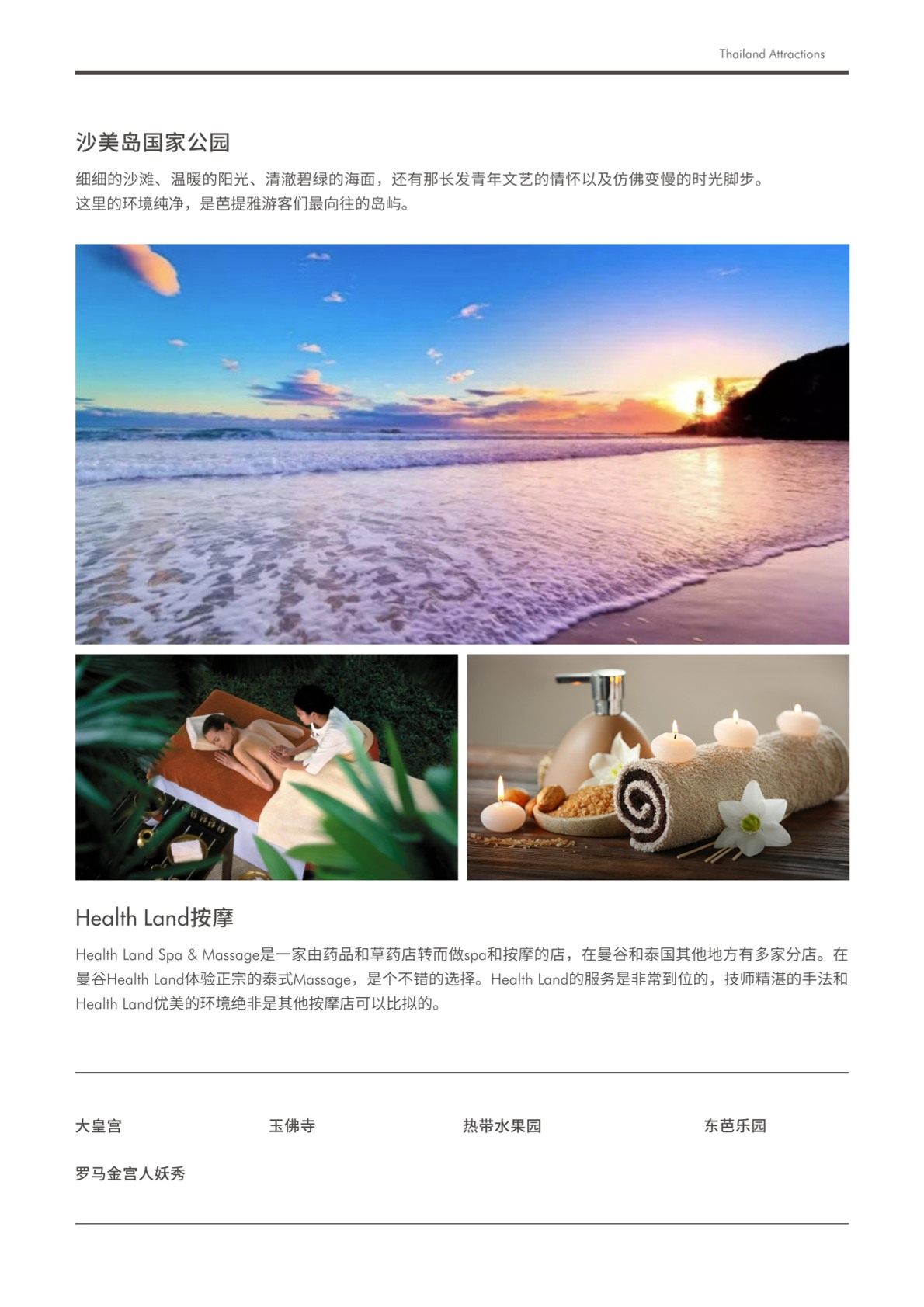 行程亮點 泰國知名連鎖品牌(pái)—Health Land 健康島泰式按摩,非常規按摩(mó)可比擬; 最美沙灘—沙美島; 芭堤雅最受(shòu)歡迎的人妖(yāo)秀之一—羅馬金宮人(rén)妖秀; 曼穀新地標、泰國最大商場—暹(xiān)羅天地 ICONSIAM、水門寺;