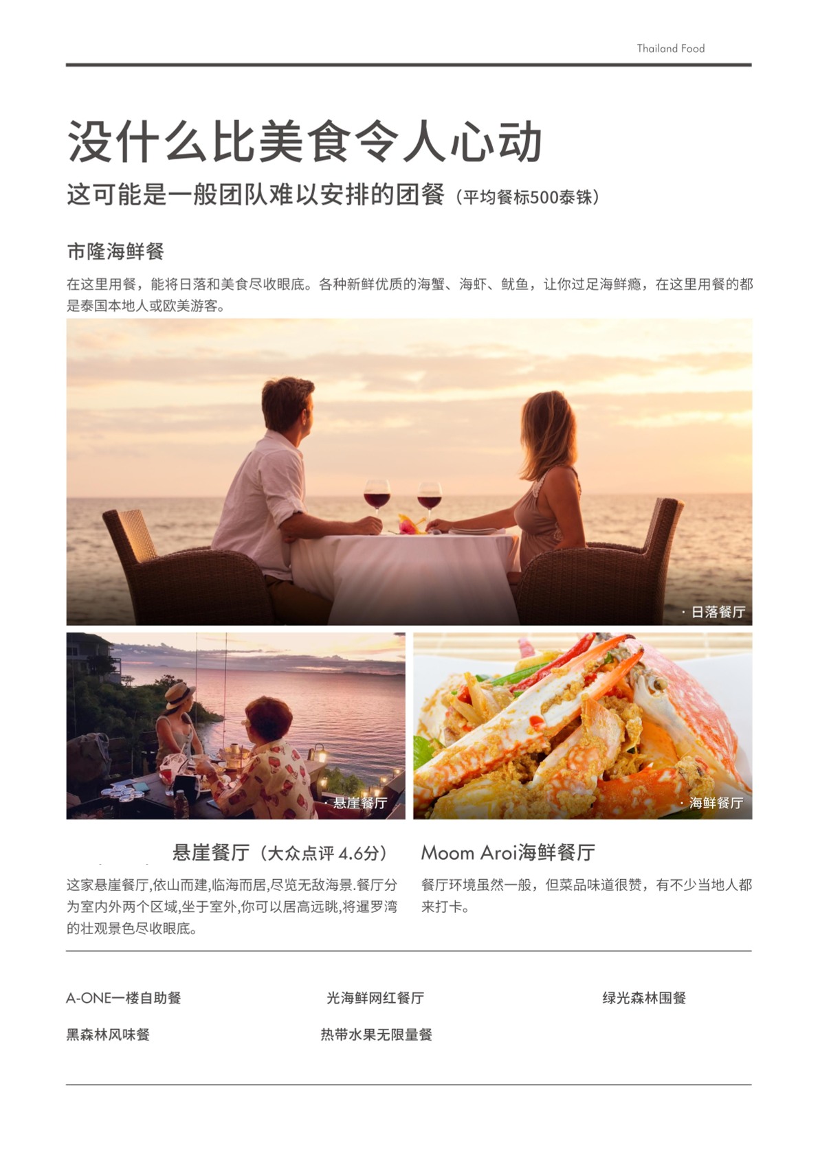 曼穀光海鮮、Moom Aroi 海鮮餐廳;Rimpa Lapin 懸(xuán)崖餐廳; 本地人最愛吃的特色餐(cān)廳:市隆漁村海鮮餐;