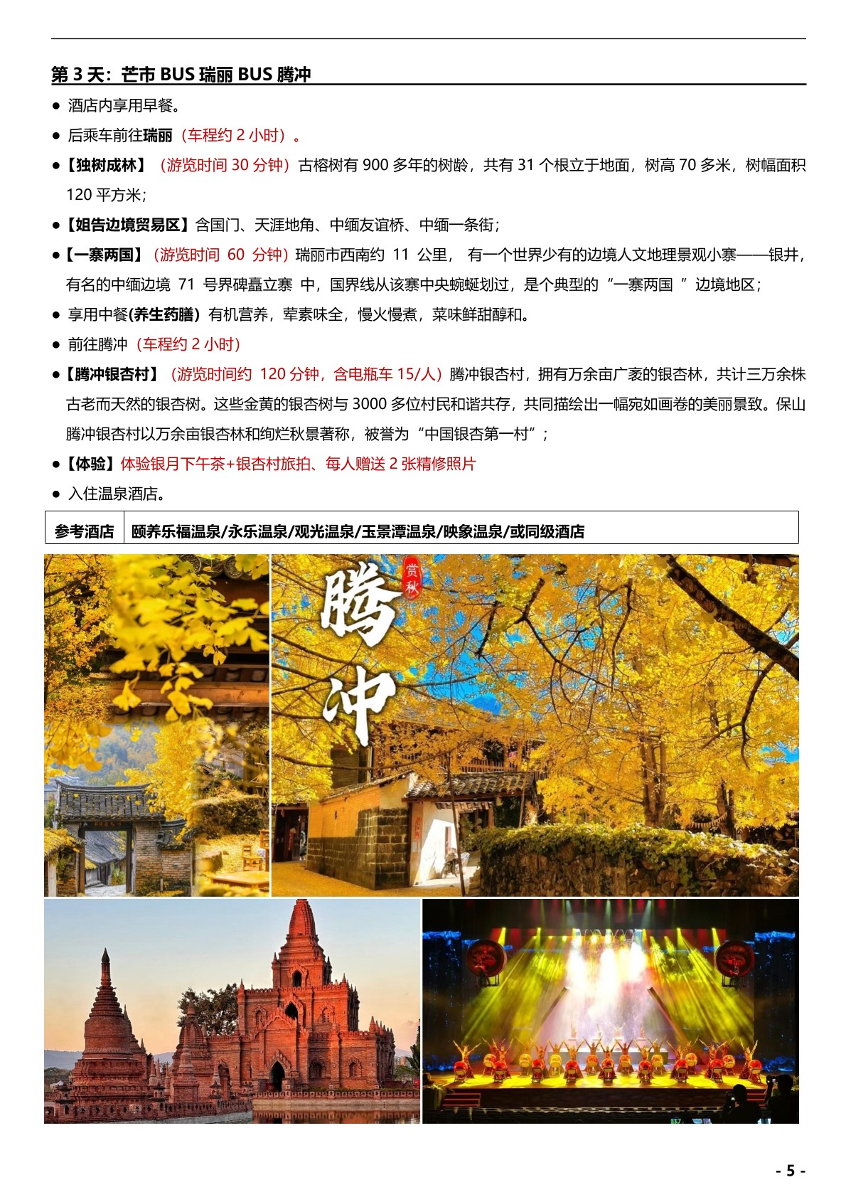 一路美景 猛(měng)煥大金塔、猛巴(bā)娜西珍奇(qí)園、傣族古鎮、獨樹成(chéng)林、一寨兩國、姐(jiě)告過門、 滇西抗戰(zhàn)博物館、熱海景區、和順僑(qiáo)鄉、司莫拉佤族村