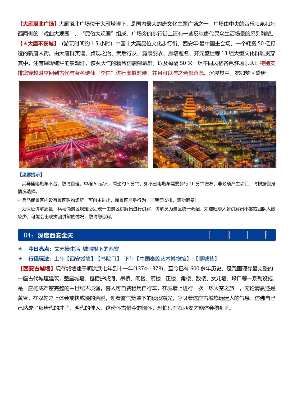D4 | 西安 【西安城墻】【書院門】【中國秦腔藝術 博物館】【順城巷體驗慢生活】 | | | 0 | 西安四鑽季楓酒店(diàn)(大明宮店(diàn))/ 維也納(胡家廟店)/錦業二路智選假日或同級 |