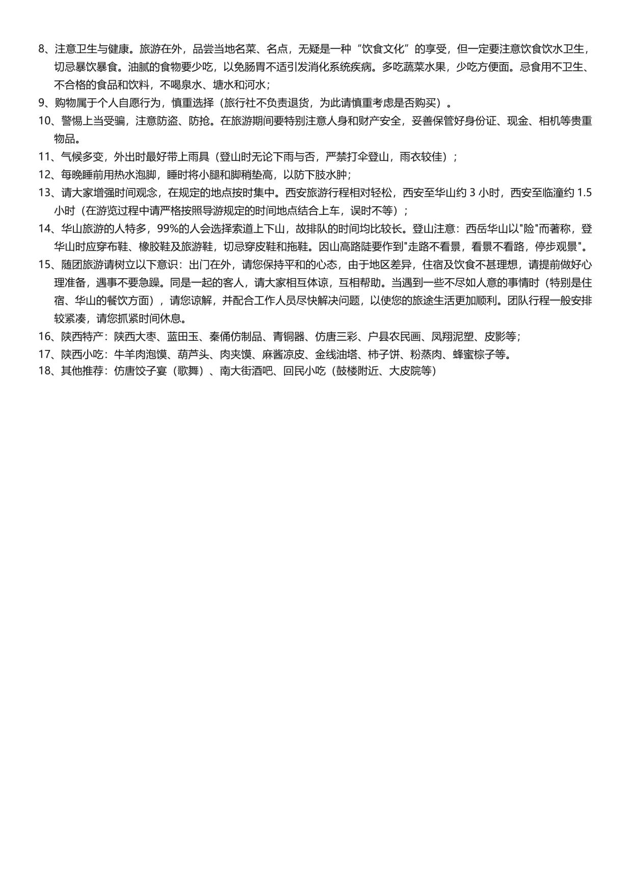 15、隨團旅遊請樹(shù)立(lì)以下意識:出門(mén)在外,請您保持平和的心態,由(yóu)於地區差異,住宿及飲食(shí)不甚理(lǐ)想,請提前做好(hǎo)心理準備,遇事不要急躁。同是一起的客人(rén),請大家相互體諒,互相幫助。當遇到一些不(bú)盡如人意的(de)事情時(特別(bié)是住宿、華山的餐飲方麵),請您諒解(jiě),並配合工作人員盡(jìn)快解決(jué)問題,以(yǐ)使您的(de)旅途生活(huó)更加順(shùn)利(lì)。團隊行程一(yī)般安排較緊湊,請您抓緊時間休息。