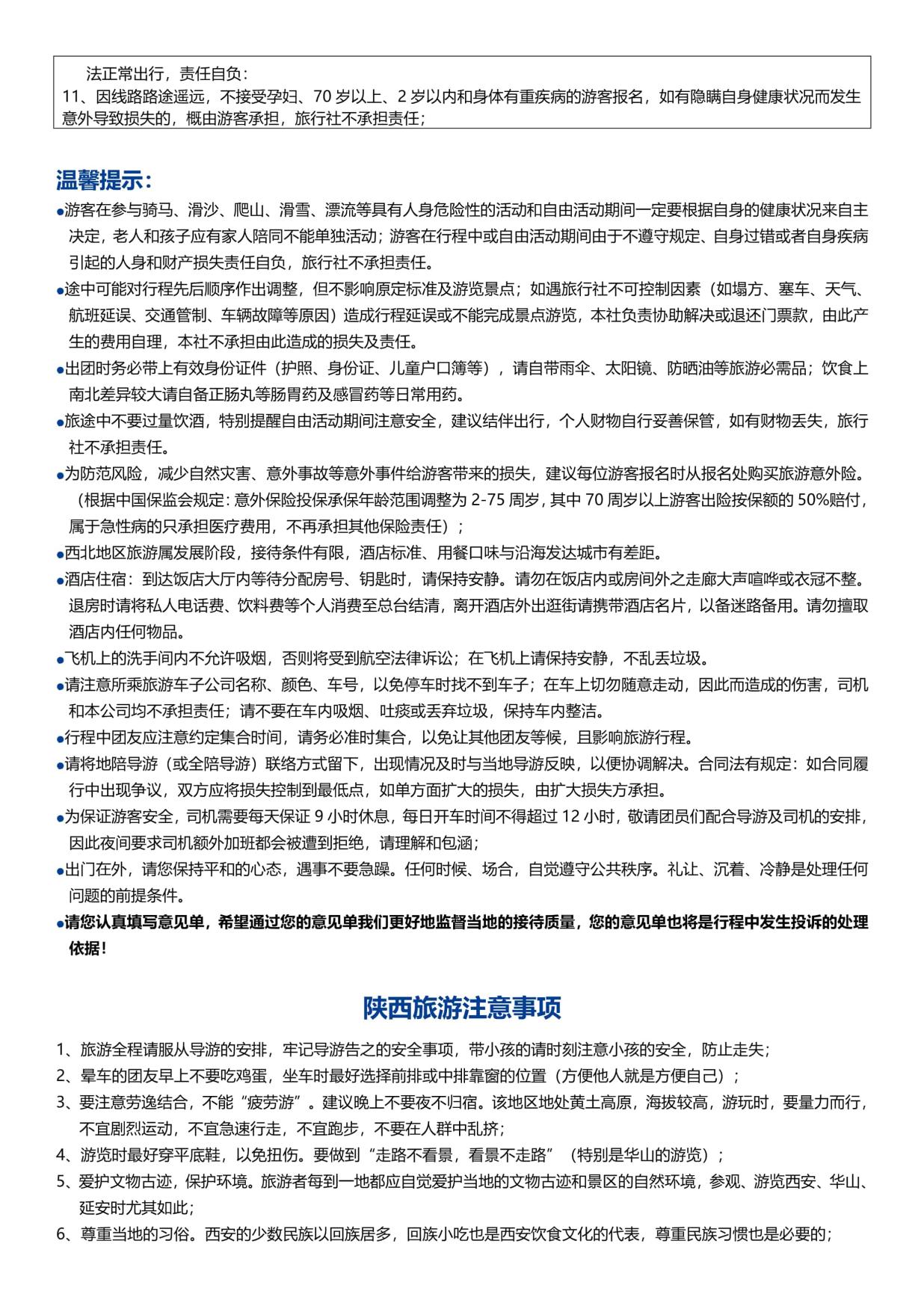 法正常出行,責任自負: 11、因(yīn)線路路途遙遠,不接受孕婦、70 歲以上、2 歲以(yǐ)內和(hé)身體有(yǒu)重疾病的遊客(kè)報(bào)名,如有隱瞞自身健康狀(zhuàng)況而發生 意外導致損失的,概由遊客承擔,旅行社不承(chéng)擔責任; |