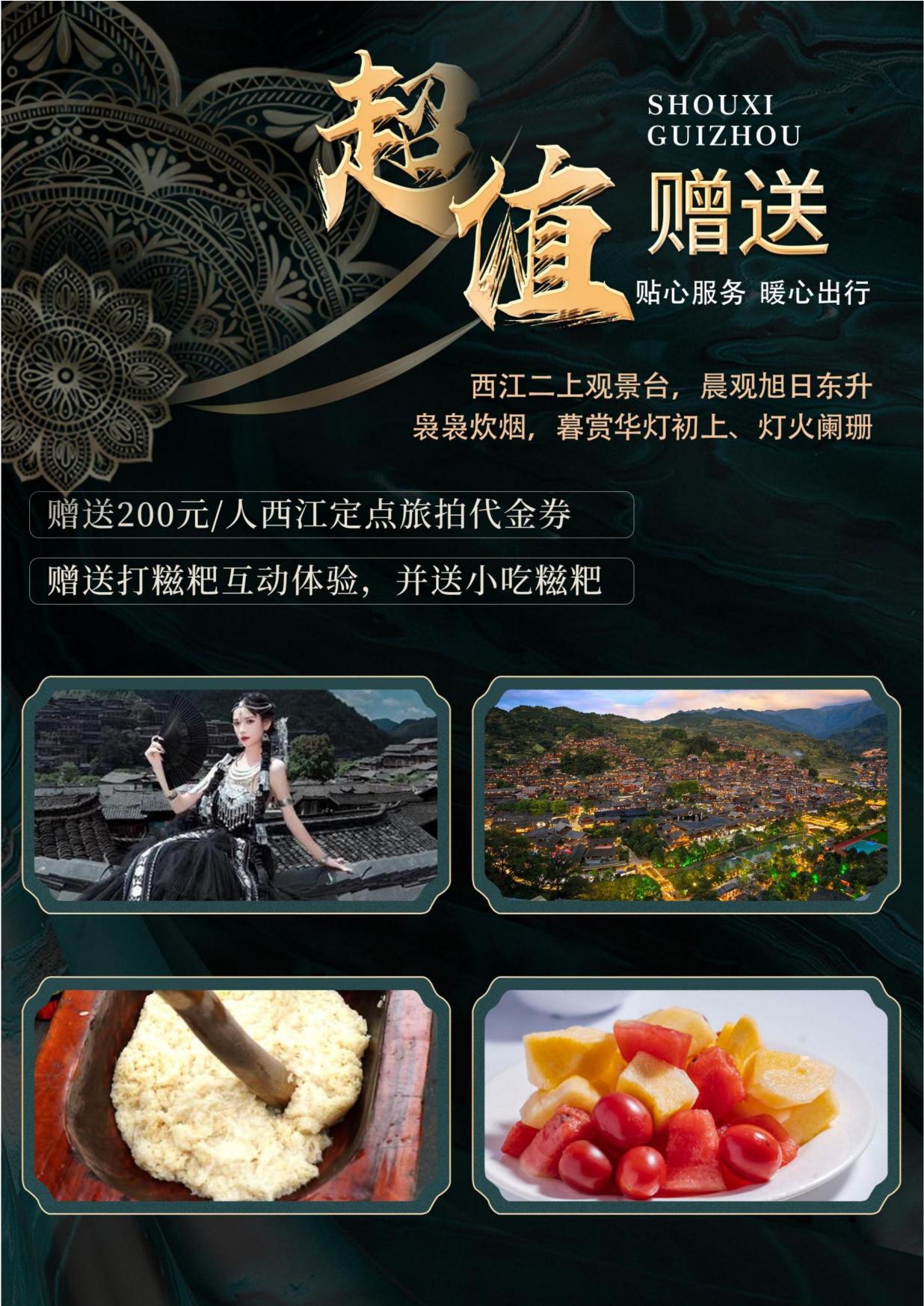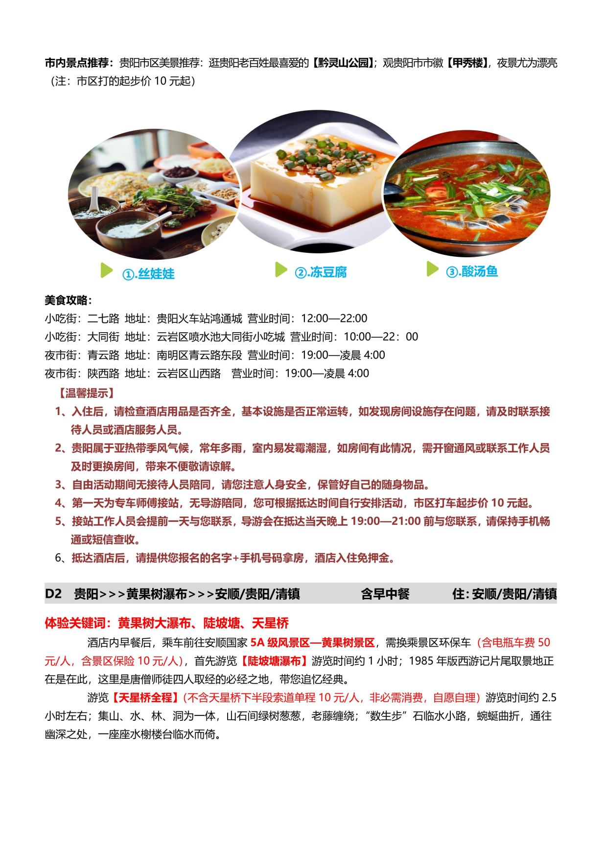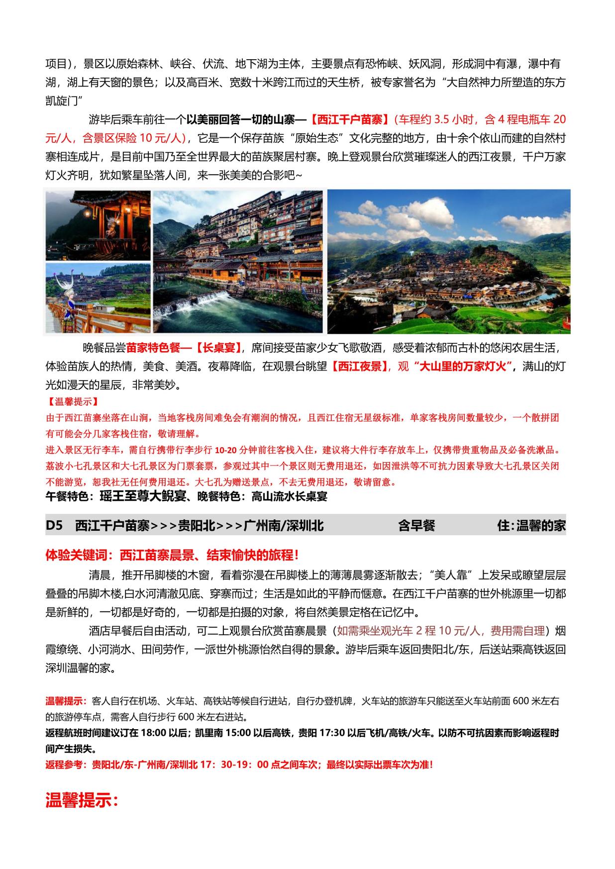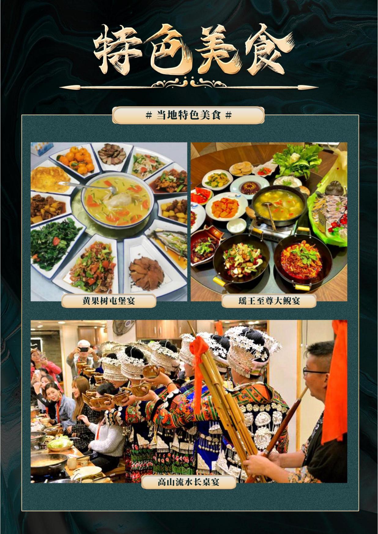 3. 用餐:含(hán)4早3正(zhèng)餐(酒店含早;正餐餐標50元/人);(當地特色美食,地道黔味體驗;行(háng)程中(zhōng)備注不含用餐敬請自(zì)理,如因(yīn)自身原因放棄用餐,無餐費(fèi)退還)