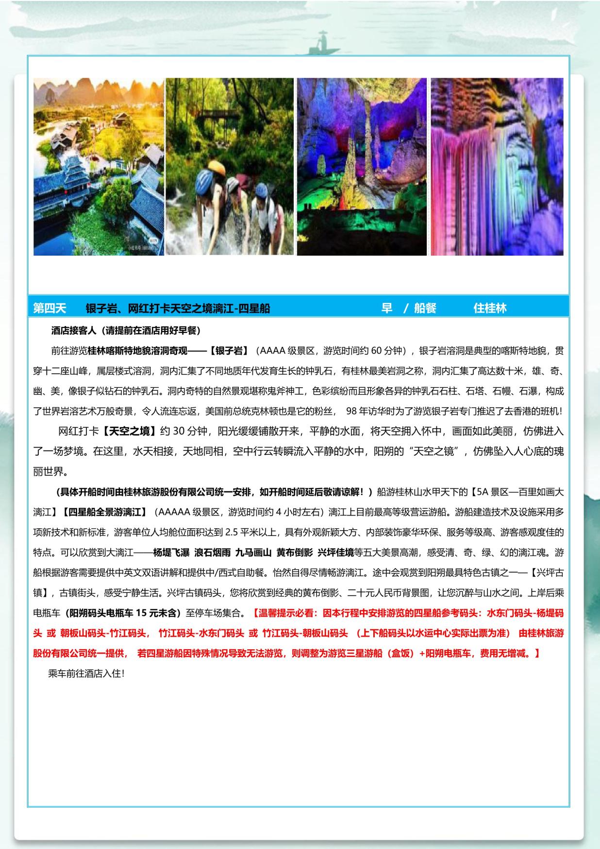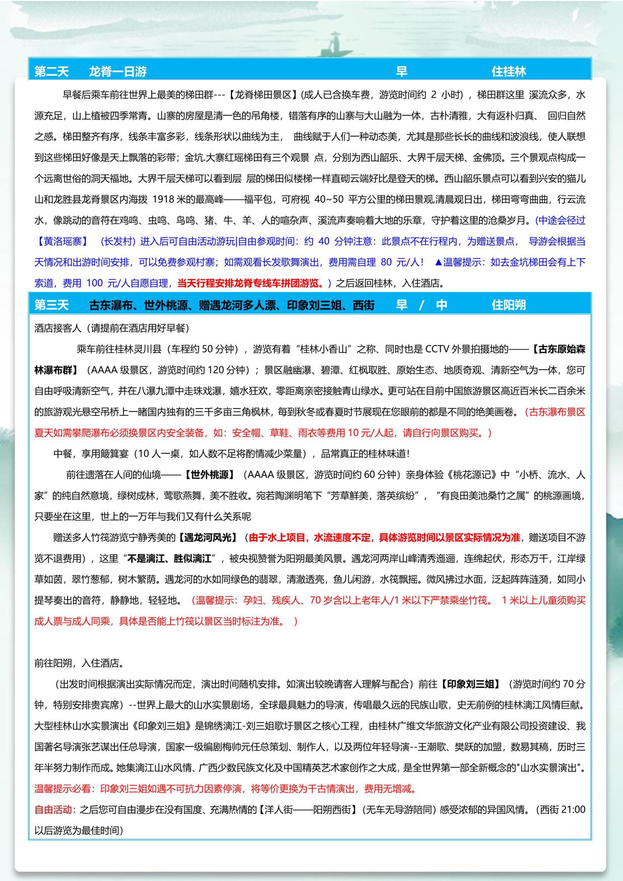 用餐標準 | 全程4早2正+1船(chuán)餐(cān)(正餐30元(yuán)/人/正,一餐船餐,一餐簸箕宴,一餐社會餐《小南國》或《金龍寨》或《謝三姐啤酒(jiǔ)魚》或自(zì)助餐。)正餐10人一桌8菜1湯,如人數不足將酌(zhuó)情減(jiǎn)少菜量(liàng),若用餐人數不足8人,導遊現退餐費;早餐(cān)在酒店為贈送,不占床無早餐)。若(ruò)自願放棄用餐,不退費用;若特色餐開餐人數不足則安排同等價(jià)值的退餐。 |