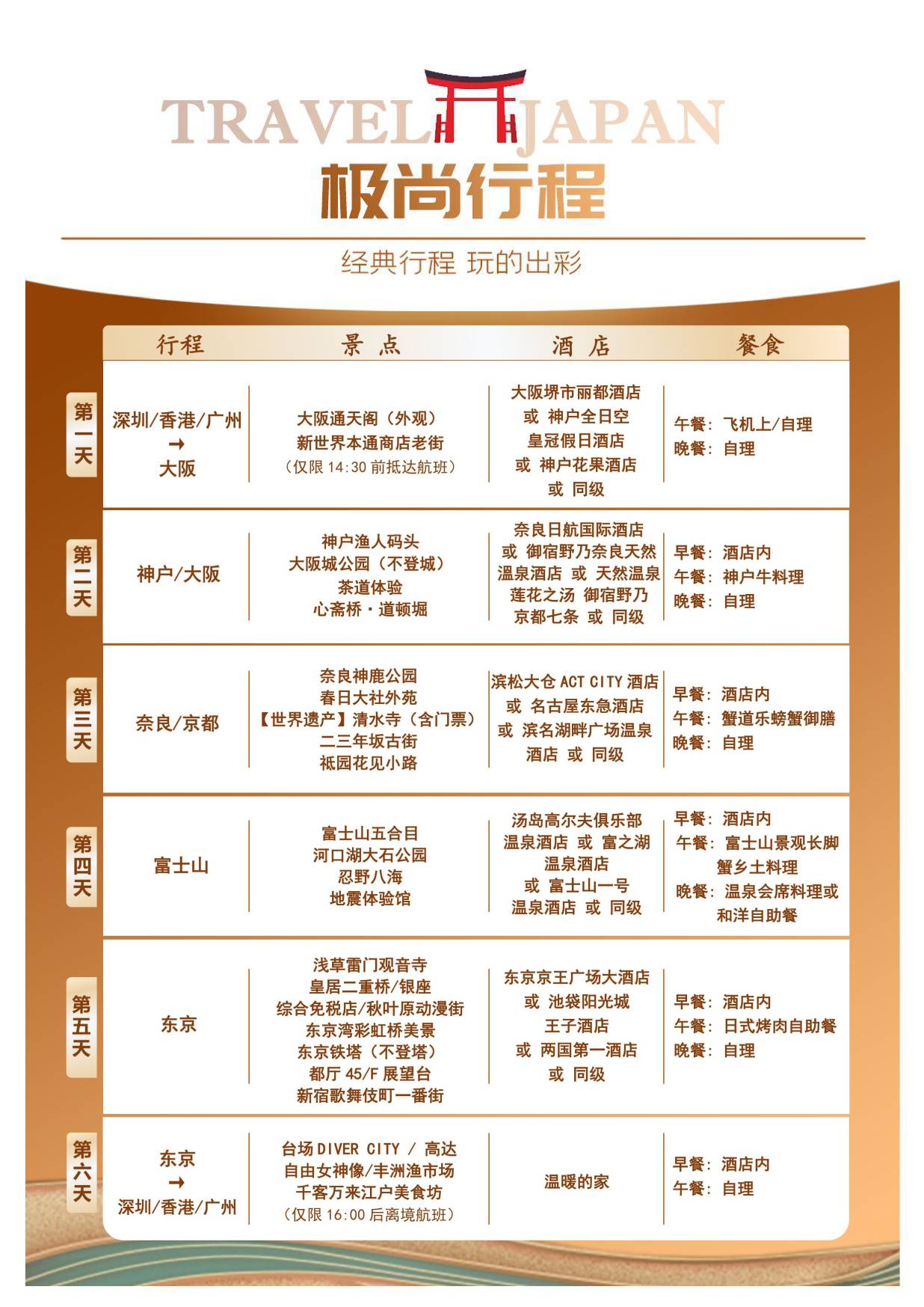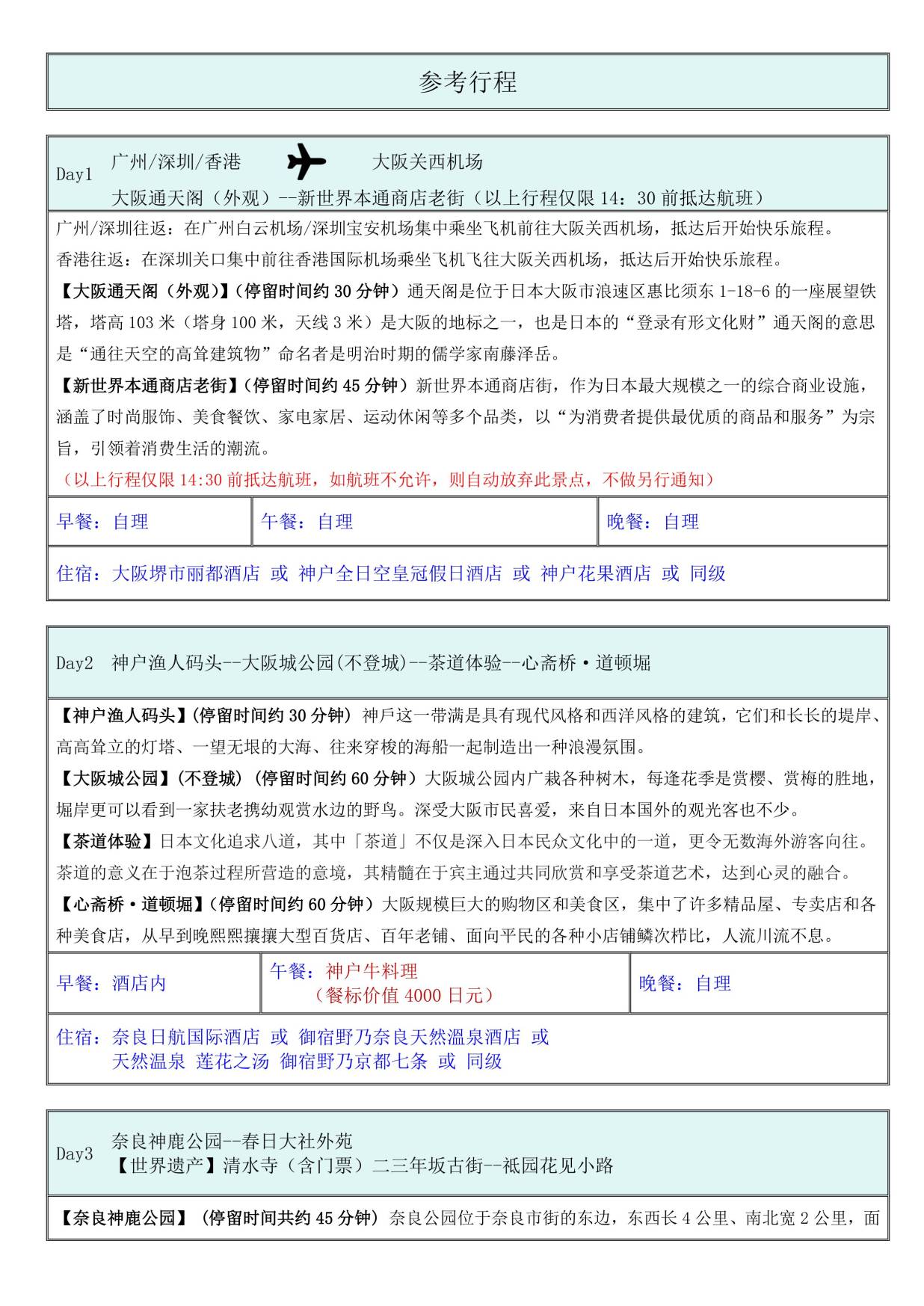 3. 根據最後確定航班,行程大阪進(jìn)、東(dōng)京出或者東京進、大阪出。我(wǒ)司有權調整景點前後次序。