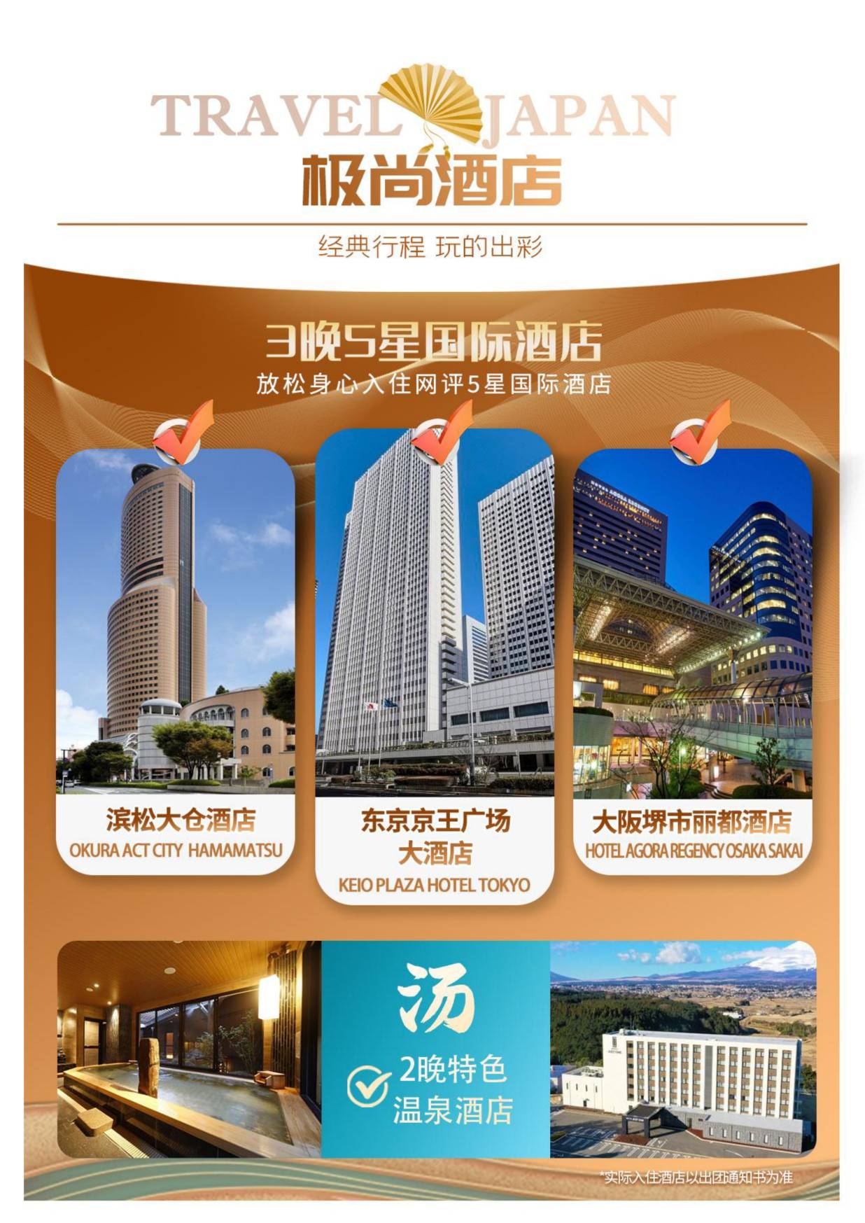 4. 暑假,櫻花,紅葉期間是當地旅遊旺季或是當地公共假期、節日、氣候等情況, 各景點(diǎn)或遊樂場等(děng)熱點遊(yóu)人較多, 本(běn)社安排之行程及餐食, 導遊將(jiāng)按照實際交(jiāo)通及遊覽情況, 上(shàng)述(shù)行程次序及景點可能臨時變動、修改或更換,如因餐(cān)廳爆滿或交通堵塞,行程中兩個自(zì)費餐,導遊將(jiāng)會以(yǐ)實際情(qíng)況調整用餐(cān)時間,本公司不作預先通知,敬請諒解 。
