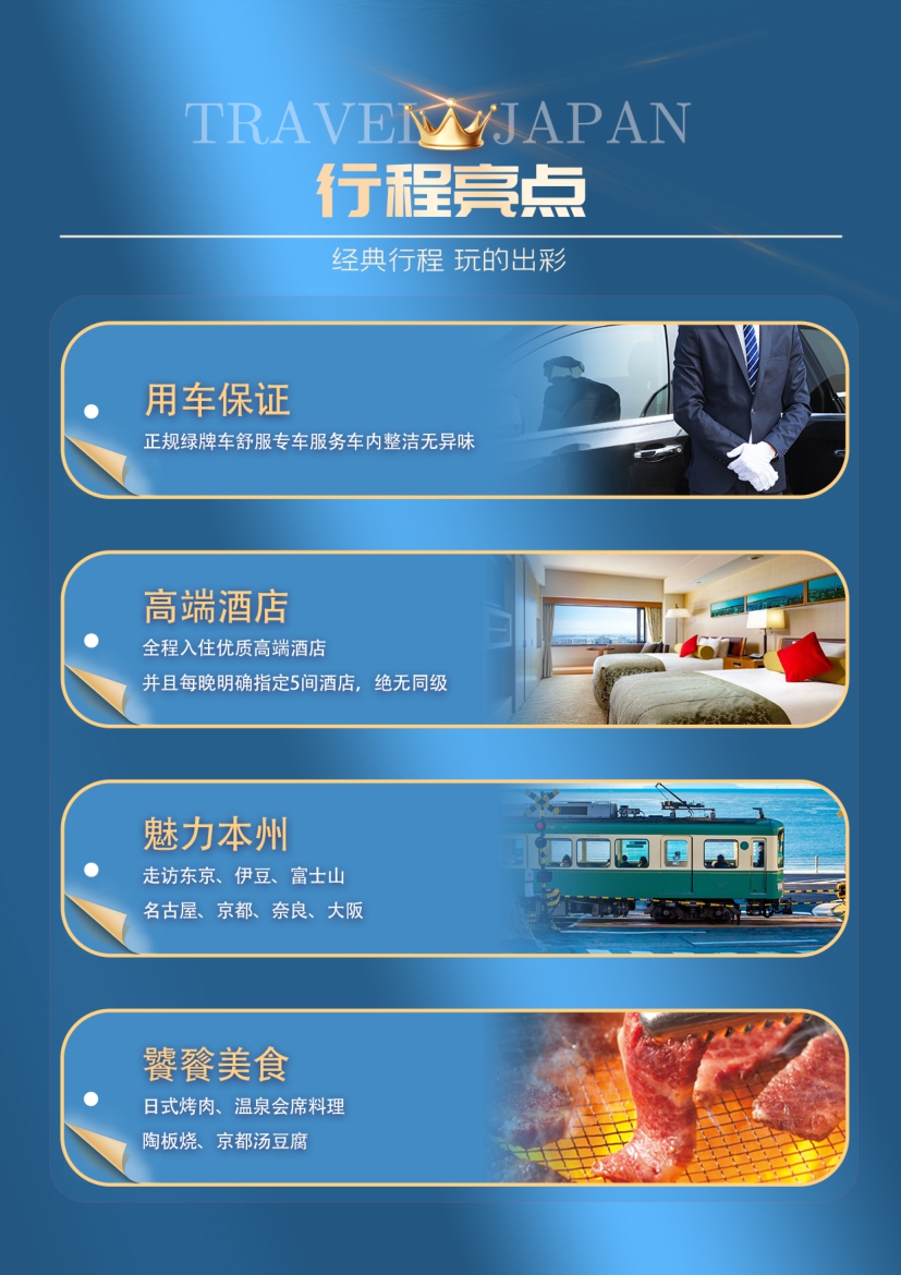 6.全程司機導遊服務費人民幣490元/人 (大小同價)7.日本旅遊(yóu)簽證人民幣 250元/人