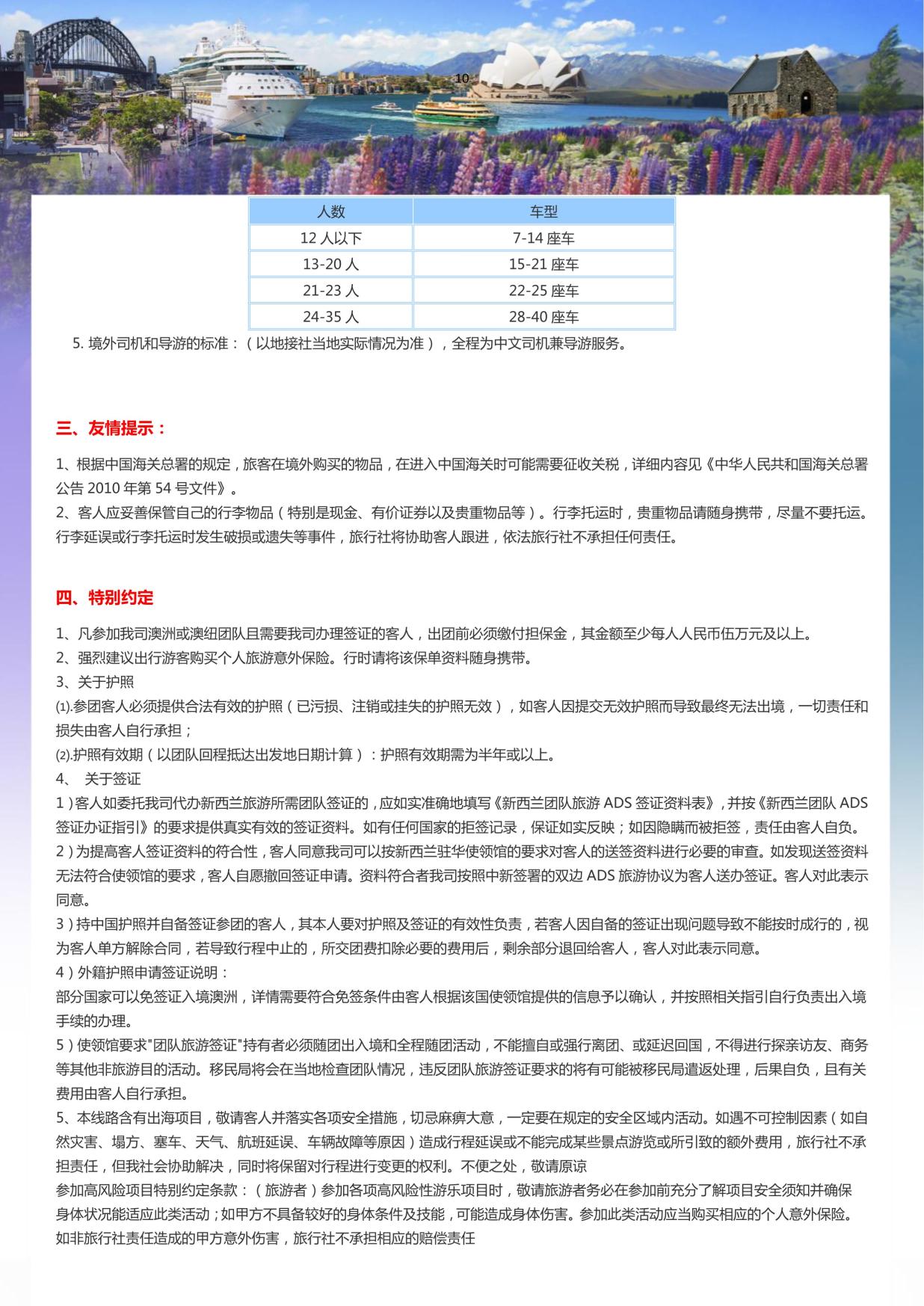 1、凡(fán)參(cān)加我司澳洲或澳紐團隊且需要我司辦理簽證的客人,出團前必須繳付擔保金,其金額至少每人人民(mín)幣伍(wǔ)萬元及以上。 2、強烈建議出行遊客購買個人旅遊意外保(bǎo)險。行時請(qǐng)將該保單資料隨身攜帶。 3、關於護照(zhào) ⑴.參團客人必須提供合法有效的護照(已汙損、注銷(xiāo)或(huò)掛失的護照無效(xiào)),如客人因提交無效護照(zhào)而(ér)導致(zhì)最終無法出境,一切責任和 損失由客人自(zì)行承擔(dān); ⑵.護照有效期(qī)(以(yǐ)團隊回程抵達出發地日(rì)期計算(suàn)):護照有效(xiào)期需為半年或以上。