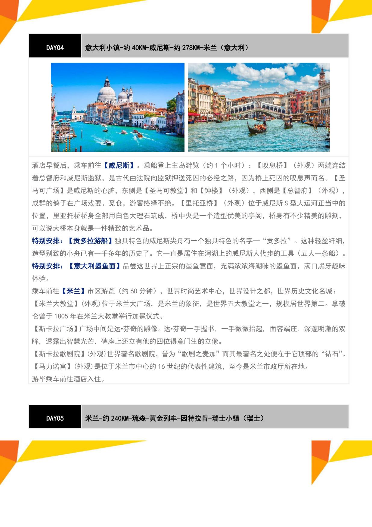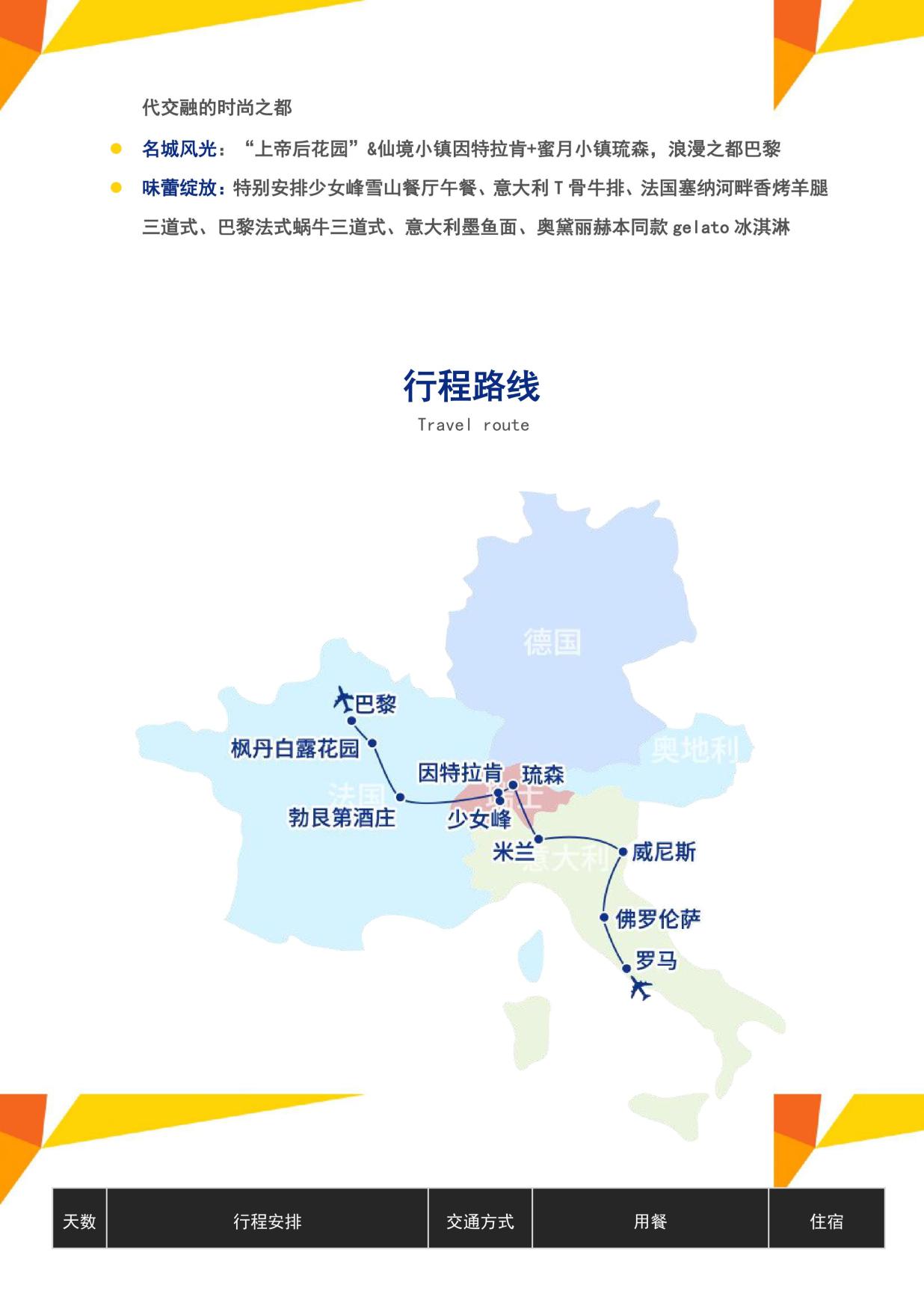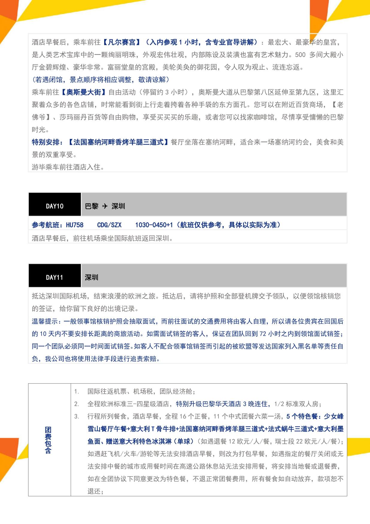 3. 行程所列餐食,酒店早(zǎo)餐,全程16個正餐,11個中式團餐六菜一湯(tāng),5個特色餐:少女(nǚ)峰雪山餐廳午餐+意大利T骨牛排+法國塞納河(hé)畔香烤羊腿三(sān)道式+法式蝸牛三道式+意大利墨魚麵、贈送意大利特色冰淇淋(單球(qiú))(如遇退餐12歐元/人/餐,瑞士段22歐元/人/餐);如遇趕飛機/火車/遊輪等無(wú)法安排酒(jiǔ)店早餐,則改為打包早(zǎo)餐,如遇指定的餐廳關(guān)閉或無法安排中餐的(de)城市或用餐時間在高(gāo)速公路(lù)休息(xī)站無法安排用餐,將安排當地餐或退餐費,如在全團協議下同意更改為特色餐,不退正常團餐費用,所有(yǒu)餐(cān)食如自動(dòng)放(fàng)棄(qì),款項恕不退還;
