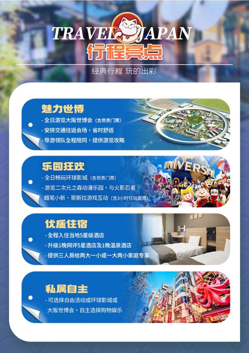 〖團費不含〗: 1.出入(rù)境行李海關課稅 2.超(chāo)重行李的托運費及保管費 3.酒店(diàn)內收費電視、電話、飲品、煙酒(jiǔ)等個人消費稅,境外個人消費費用自理。 4.由(yóu)於目前國際燃油稅不斷上漲, 若航空公司臨(lín)時調整燃油稅, 本社(shè)有權按(àn)實際情況補收稅金差價, 敬請配合(hé)! 5.旅客旅遊意外險(請建議客人自行購買) 6.全程司機導遊(yóu)服務費人民幣350/人 (大小同價)7.日本旅遊簽(qiān)證250/人 8.全程(chéng)單房差RMB2800元(yuán)/人 |