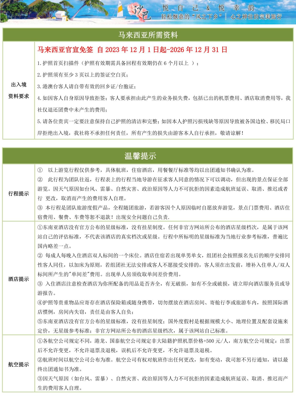 2.馬(mǎ)來西亞政(zhèng)府旅遊稅10馬幣/間/晚(現付酒店前台);